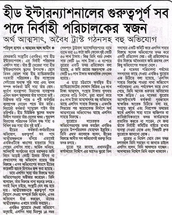 বেসরকারি সংস্থাটির (এনজিও) নাম হীড ইন্টারন্যাশনাল। এর নির্বাহী পরিচালক এলগিন সাহা। তাঁর স্ত্রী তেরেজা সাহা হীড ইন্টারন্যাশনাল স্কুলের উপাধ্যক্ষ। ছেলে তিমন তোরণ সাহা হীড হ্যান্ডিক্রাফটের সহকারী পরিচালক। হীড ল্যাঙ্গুয়েজ সেন্টারের অধ্যক্ষ সুপ্তি সাহা এবং মানব সম্পদ কর্মকর্তা ঊর্মি সাহা তাঁর বোন। দুর্যোগ ব্যবস্থাপনা বিভাগের ব্যবস্থাপক এলিস অরুণ মজুমদার তাঁর মামাতো ভাই। নিরীক্ষক বাপ্পি পান্ডে ও পুষ্টি কর্মসূচির ব্যবস্থাপক নোয়েল পান্ডে তাঁর ভাগ্নে। লিয়াজোঁ কর্মকর্তা স্যামুয়েল গাইন তাঁর ভগ্নিপতি। হীড মিউজিক স্কুলের অধ্যক্ষ দিলীপ সরকার তাঁর ছেলের শ্বশুর। ক্ষুদ্রঋণ বিভাগের পরিচালক নিখিল কৃষ্ণ সাহা ও নিখিল চন্দ্র সাহা তাঁর দুই ভাই। হীডের কর্মকর্তা-কর্মচারীদের অভিযোগ, গুরুত্বপূর্ণ সব পদে আত্মীয়স্বজনকে বসিয়ে এভাবেই এনজিওটিকে ধ্বংসের দ্বারপ্রান্তে নিয়ে গেছেন এলগিন সাহা। আর্থিক অনিয়ম, আদিবাসী সংগঠনের নামে বরাদ্দকৃত জমি কিনে আড়াই কোটি টাকার হিসাব না দেখানোসহ বহু অভিযোগ রয়েছে তাঁর বিরুদ্ধে। এসব অভিযোগের কারণে হীডের কয়েকটি ব্যাংক হিসাবও জব্দ করা হয়েছে। তবে এলগিন সাহা তাঁর বিরুদ্ধে আনা অভিযোগগুলো অস্বীকার করেছেন। তিনি বলেছেন, তাঁর বিরুদ্ধে নানা ষড়যন্ত্র চলছে। সবাই মিলে চাইছে, সংস্থাটি যেন বন্ধ হয়ে যায়। আত্মীয়স্বজনকে গুরুত্বপূর্ণ পদে নিয়োগ দেওয়া সম্পর্কে তিনি বলেন, এসব অভিযোগ যাঁরা করছেন, তাঁদের আত্মীয়স্বজনও এখানে চাকরি করছেন। এনজিও ব্যুরোতে দেওয়া অভিযোগ অনুযায়ী, এলগিন সাহা মিরপুর ১৪ নম্বর সেকশনে ট্রাইবাল অ্যাসোসিয়েশনের নামে বরাদ্দ করা ২০ কাঠা জমি কেনেন দুই কোটি ৫০ লাখ টাকায়। কিন্তু তিনি খরচ দেখান সাত কোটি ৬০ লাখ টাকা। এ ব্যাপারে ব্যুরোর একটি তদন্ত প্রতিবেদনে বলা হয়েছে, এ জমি ক্রয়ের অন্ততপক্ষে এক কোটি ৮০ লাখ টাকার অস্বাভাবিক লেনদেন হয়েছে। এ ছাড়া চট্টগ্রামে অবস্থিত হীড হ্যান্ডিক্র্যাফটের দোকান বিক্রির ২৩ লাখ টাকা আত্মসাত্, সংস্থার টাকায় খুলনায় বোনের বাড়ি নির্মাণ, ভুয়া বায়না করে ৫০ লাখ টাকা আত্মসাত্সহ বহু অভিযোগ আছে এলগিন সাহার বিরুদ্ধে। এমনকি সিডরের পর আশ্রয়কেন্দ্র নির্মাণে অর্থ আত্মসাতের অভিযোগও আছে এলগিন সাহার বিরুদ্ধে। ব্যুরোতে দায়েরকৃত এ অভিযোগগুলোর তদন্ত করছেন এনজিও ব্যুরোর উপপরিচালক মোহাম্মদ ইব্রাহিম। তিনি প্রথম আলোকে বলেন, হীডের বিরুদ্ধে আনীত সব অভিযোগই গুরুত্ব দিয়ে তদন্ত চলছে।ব্যুরো সূত্র জানায়, প্রধানমন্ত্রীর কার্যালয়ের নির্দেশে এর আগেও ব্যুরো তিন সদস্যের একটি কমিটি করে এলগিন সাহার বিরুদ্ধে অনেক অভিযোগের তদন্ত করে একটি প্রতিবেদন দেয়। ওই প্রতিবেদনেও তাঁর বিরুদ্
