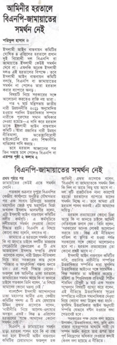 ইসলামী আইন বাস্তবায়ন কমিটির ঘোষিত ৪ এপ্রিলের হরতালে প্রধান দুই বিরোধী দল বিএনপি বা জামায়াতে ইসলামী কেউই সমর্থন দেবে না। এমনকি অনেক ইসলামি দলও এই হরতালের বিপক্ষে। তবে ইসলামী আইন বাস্তবায়ন কমিটি বলছে, বিএনপি বা জামায়াতের সমর্থন না পেলেও তারা হরতাল করার ব্যাপারে অনড়।বিষয়টি নিয়ে সরকারের সঙ্গে আলোচনা করতেও রাজি নয় তারা।গত ৭ মার্চ মন্ত্রিসভায় জাতীয় নারী উন্নয়ননীতি ২০১১ অনুমোদিত হওয়ার পরদিন উত্তরাধিকার সম্পদে নারীকে পুরুষের সমান অধিকার দেওয়া হয়েছে—এ দাবি করে হরতাল ডাকে ইসলামী আইন বাস্তবায়ন কমিটি। তারা প্রস্তাবিত নারী উন্নয়ন নীতিমালা, ফতোয়াবিরোধী হাইকোর্টের রায় এবং শিক্ষানীতি বাতিলের দাবি করছে।তবে হরতাল আহ্বানের পর তিন সপ্তাহ চলে গেলেও বিএনপি বা জামায়াতের কেউই এতে সমর্থন দেয়নি।গতকাল শুক্রবার দুপুরে বিএনপির কেন্দ্রীয় কার্যালয়ে অনুষ্ঠিত যৌথসভার পর এক সংবাদ ব্রিফিংয়ে ভারপ্রাপ্ত মহাসচিব জ্যেষ্ঠ যুগ্ম মহাসচিব মির্জা ফখরুল ইসলাম আলমগীর বলেন, এটা ইসলামী আইন বাস্তবায়ন কমিটির দলীয় কর্মসূচি। এ কর্মসূচিতে দলীয়ভাবে সমর্থন দেওয়ার কোনো সিদ্ধান্ত হয়নি। বিএনপি এ বিষয়ে কোনো কথা বলেনি, বলবেও না।জামায়াত এ হরতালে সমর্থন দেবে কি না জানতে চাইলে দলটির ভারপ্রাপ্ত সেক্রেটারি জেনারেল এ টি এম আজহারুল ইসলাম সম্প্রতি প্রথম আলোকে বলেন, নারী উন্নয়ন নীতিমালা নিয়ে তারা সরকারের কাছ থেকে ‘পরিষ্কার ও আনুষ্ঠানিক’ বক্তব্য শুনতে চান। এর পরই সিদ্ধান্ত নেবেন। ফজলুল হক আমিনীর ডাকা হরতালে জামায়াতের সমর্থন আছে কি না জানতে চাইলে গতকাল তিনি বলেন, ‘এ বিষয়ে আমাদের কোনো মন্তব্য নেই।’বাংলাদেশ ইসলামী আন্দোলনের ঢাকা মহানগর আমীর এবং কেন্দ্রীয় কমিটির সদস্য এ টি এম হেমায়েত উদ্দিন প্রথম আলোকে বলেন, ‘নারীনীতি নিয়ে আলেম-ওলামার অবস্থান একই। কিন্তু ৪ এপ্রিলের হরতালের পক্ষে আমাদের কোনো সমর্থন নেই।’বিএনপি ও জামায়াতের সমর্থন ছাড়া হরতাল পালন হবে কি না প্রশ্ন করা হলে ইসলামী আইন বাস্তবায়ন কমিটির চেয়ারম্যান ফজলুল হক আমিনী প্রথম আলোকে বলেন, ‘বিএনপি বা জামায়াতকে সমর্থন দিল কি দিল না তাতে কিছু যায় আসে না। দল দুটি রাজনৈতিক নানা কারণেই হয়তো হরতালের ব্যাপারে তাদের সমর্থন দিচ্ছে না। তবে আমরা এই হরতাল পালন করবই। এটা আমাদের দায়িত্ব।’ হরতাল প্রত্যাহারের কোনো চিন্তা আছে কি না জানতে চাইলে আমিনী নেতিবাচক জবাব দেন। তিনি বলেন, ‘সরকারের অনেক লোকই আলোচনা করতে চায়। কিন্তু এই নীতিমালা বাতিল বা স্থগিত না হওয়া পর্যন্ত সরকারের সঙ্গে কোনো আলোচনাও হবে না। হরতাল প্রত্যাহারের তো কোনো প্রশ্নই আসে না।’ইসলামী আইন বাস্তবায়ন কমিটির দাবি, প্রস্তাবিত নারীনী