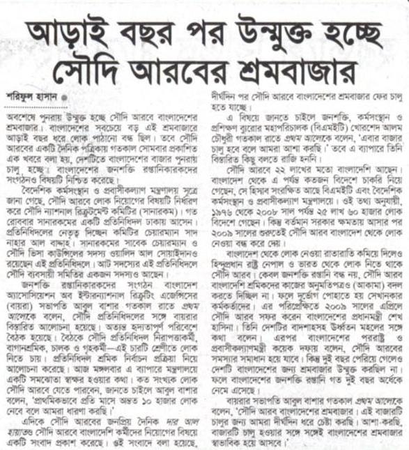 অবশেষে পুনরায় উন্মুক্ত হচ্ছে সৌদি আরবে বাংলাদেশের শ্রমবাজার। বাংলাদেশের সবচেয়ে বড় এই শ্রমবাজারে আড়াই বছর ধরে লোক পাঠানো বন্ধ ছিল। তবে সৌদি আরবের একটি দৈনিক পত্রিকায় গতকাল সোমবার প্রকাশিত এক খবরে বলা হয়, দেশটিতে বাংলাদেশের বাজার পুনরায় চালু হচ্ছে। বাংলাদেশের জনশক্তি রপ্তানিকারকদের সংগঠনও বিষয়টি নিশ্চিত করেছে।বৈদেশিক কর্মসংস্থান ও প্রবাসীকল্যাণ মন্ত্রণালয় সূত্রে জানা গেছে, সৌদি আরবে লোক নিয়োগের বিষয়টি নির্ধারণ করে সৌদি ন্যাশনাল রিক্রুটমেন্ট কমিটির (সানারকম)। গত রোববার সানারকমের একটি প্রতিনিধিদল ঢাকায় আসেন। প্রতিনিধিদলের নেতৃত্ব দিচ্ছেন কমিটির চেয়ারম্যান সাদ নাহার আল বাদ্দাহ। সানারকমের সাবেক চেয়ারম্যান ও সৌদি ভিসা কাউন্সিলের সদস্য ওয়ালিদ আল সোয়াইদানও রয়েছেন এই প্রতিনিধিদলে। আট সদস্যের এই প্রতিনিধিদলে সৌদি ব্যবসায়ী সমিতির একজন সদস্যও আছেন। জনশক্তি রপ্তানিকারকদের সংগঠন বাংলাদেশ অ্যাসোসিয়েশন অব ইন্টারন্যাশনাল রিক্রুটিং এজেন্সিসের (বায়রা) সভাপতি আবুল বাশার গতকাল রাতে প্রথম আলোকে বলেন, সৌদি প্রতিনিধিদলের সঙ্গে বায়রার বিস্তারিত আলোচনা হয়েছে। অত্যন্ত হূদ্যতাপূর্ণ পরিবেশে বৈঠক হয়েছে। বৈঠকে সৌদি প্রতিনিধিদল নিরাপত্তাকর্মী, বাগানশ্রমিক, চালক ও গৃহকর্মী—এই চারটি শ্রেণীতে লোক নিতে চায়। প্রতিনিধিদল শ্রমিক নির্বাচন প্রক্রিয়া নিয়ে আলোচনা করেছে। আজ মঙ্গলবার এ ব্যাপারে মন্ত্রণালয়ে একটি সমঝোতা স্বাক্ষর হওয়ার কথা। কত সংখ্যক লোক সৌদি আরবে যেতে পারবেন, জানতে চাইলে আবুল বাশার বলেন, ‘প্রাথমিকভাবে প্রতি মাসে অন্তত ১০ হাজার লোক নেবে বলে আমরা ধারণা করছি।’ এদিকে সৌদি আরবের জনপ্রিয় দৈনিক দার আল হায়াতও সৌদি আরবে বাংলাদেশি কর্মীদের নিয়োগের বিষয়ে একটি সংবাদ প্রকাশ করেছে। ওই সংবাদে বলা হয়েছে, দীর্ঘদিন পর সৌদি আরবে বাংলাদেশের শ্রমবাজার ফের চালু হতে যাচ্ছে। এ বিষয়ে জানতে চাইলে জনশক্তি, কর্মসংস্থান ও প্রশিক্ষণ ব্যুরোর মহাপরিচালক (বিএমইটি) খোরশেদ আলম চৌধুরী গতকাল রাতে প্রথম আলোকে বলেন, ‘এবার বাজার চালু হবে বলে আমরা আশা করছি।’ তবে এ ব্যাপারে তিনি বিস্তারিত কিছু বলতে রাজি হননি। সৌদি আরবে ২২ লাখের মতো বাংলাদেশি আছেন। বাংলাদেশ থেকে এ পর্যন্ত কতজন বিদেশে চাকরি নিয়ে গেছেন, সে হিসাব সংরক্ষিত আছে বিএমইটি এবং বৈদেশিক কর্মসংস্থান ও প্রবাসীকল্যাণ মন্ত্রণালয়ে। ওই তথ্য অনুযায়ী, ১৯৭৬ থেকে ২০০৮ সাল পর্যন্ত ২৫ লাখ ৬০ হাজার লোক বিদেশে গেছেন। কিন্তু বর্তমান সরকার ক্ষমতায় আসার পর ২০০৯ সালের শুরুতেই সৌদি আরব বাংলাদেশ থেকে লোক নেওয়া বন্ধ করে দেয়। বাংলাদেশ থেকে লোক নেওয়া রাতারাতি কমিয়ে দিলেও হিন্দুপ্রধান রাষ