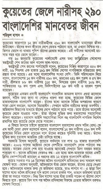 কুয়েতের কারাগারে ১২ জন নারীকর্মীসহ ২৯০ জন বাংলাদেশি মানবেতর জীবন কাটাচ্ছেন। তাঁদের কখন কীভাবে দেশে ফেরত পাঠানো হবে, তা এখনো নিশ্চিত নয়। ভিসার মেয়াদ না থাকায় পুলিশ তাঁদের গ্রেপ্তার করেছে। এই কর্মীদের অনেকেই ছয়-সাত বছর ধরে জেলে আছেন।গত ২০ জানুয়ারি কুয়েতের পার্লামেন্টে এসব তথ্য জানিয়েছেন সেদেশের স্বরাষ্ট্রমন্ত্রী শেখ জাবের আল খালেদ আল-সাবাহ। স্বরাষ্ট্রমন্ত্রী শেখ জাবের পার্লামেন্টে বলেন, কুয়েতের বিভিন্ন কারাগারে ৩৫০ জন নারী, ২৬ শিশুসহ এক হাজার ১৮১ জন বিভিন্ন দেশের নাগরিককে বহিষ্কারের জন্য প্রস্তুত রাখা হয়েছে। এর মধ্যে বাংলাদেশির সংখ্যা বেশি। তিনি পরিসংখ্যান দিয়ে বলেন, বাংলাদেশের ১২ জন নারীসহ ২৯০ জন, ভারতের ২৪১ জন পুরুষ ও ৫৭ জন নারী, শ্রীলঙ্কার ৮৮ জন নারীসহ ১১৫ জন, মিসরের দুজন নারীসহ ১০৬ জন, পাকিস্তানের ৭৯ জন পুরুষ এবং ফিলিপাইনের ৬৮ জন নারী ও ছয়জন পুরুষ রয়েছেন।কুয়েতের একজন প্রবাসী বাংলাদেশি সাংবাদিক কামরুল হাসান প্রথম আলোকে জানান, সঠিক তথ্য জানা না গেলেও ধারণা করা হচ্ছে, কুয়েতের বিভিন্ন জেলে হাজারখানেক বাংলাদেশি আছেন। তাঁদের মধ্যে অনেকে বিভিন্ন অপরাধের কারণে সাজা ভোগ করছেন, অনেকে বিচারাধীন। সেখানে আটক নারীদের অবস্থা অবর্ণনীয়। অভিবাসন বিভাগের মাধ্যমে তাঁদের দেশে পাঠানো হতে পারে। তবে তাঁদের অনেকেই কুয়েতে থেকে যাওয়ার পক্ষে। তাঁরা তাঁদের মুক্তির জন্য দূতাবাসের সহযোগিতা কামনা করেছেন। দূতাবাস আইনি সহযোগিতা দিলে বহু বাংলাদেশি নাগরিক নির্দোষ প্রমাণিত হয়ে কুয়েতে থেকে যেতে পারবেন।এ বিষয়ে জানতে চাইলে কুয়েতের বাংলাদেশ দূতাবাসের প্রথম সচিব (শ্রম) কে এম আলী রেজা প্রথম আলোকে বলেন, বাংলাদেশের ১২ জন নারীসহ ২৯০ জন বন্দী কুয়েতের বিভিন্ন জেলে রয়েছেন বলে তাঁদের কাছেও সুনির্দিষ্ট তথ্য আছে। তাঁদের মুক্তির জন্য দূতাবাস আন্তরিক চেষ্টা চালিয়ে যাচ্ছে।সরকারি হিসাব অনুযায়ী, কুয়েতে বর্তমানে চার লাখ ৭৯ হাজার বাংলাদেশি আছেন। ২০০৬ সালের অক্টোবর থেকে দেশটিতে বাংলাদেশি লোক পাঠানো বন্ধ রয়েছে। কাজের মেয়াদ শেষ হয়ে যাওয়ায় অনেকেই সেখানে ভিসা নবায়ন করতে পারছেন না। অনেক শ্রমিকের বেতনও বন্ধ। এর মধ্যে আল-আরবাজ নামের একটি ক্লিনিং কোম্পানিতেই রয়েছেন এ ধরনের প্রায় ১২ হাজার বাংলাদেশি শ্রমিক।কুয়েত সরকার গত ১৪ ডিসেম্বর অবৈধ বাংলাদেশি শ্রমিকদের জন্য সাধারণ ক্ষমা ঘোষণা করে। ঘোষণা অনুযায়ী, অবৈধভাবে যাঁরা জেলে আছেন, তাঁদের ছেড়ে দেওয়া হবে। অবৈধভাবে থাকার জন্য যে জরিমানা হয়েছে, তাও লাগবে না। এ ছাড়া তিন মাসের মধ্যে অবৈধ শ্রমিকেরা যদি ভালো কোনো চাকরি পান, তাহলে জরিমানা ছাড়াই তাঁরা তা করতে পারবেন। কিন্তু তিন মাসের মধ্যে যাঁরা চ