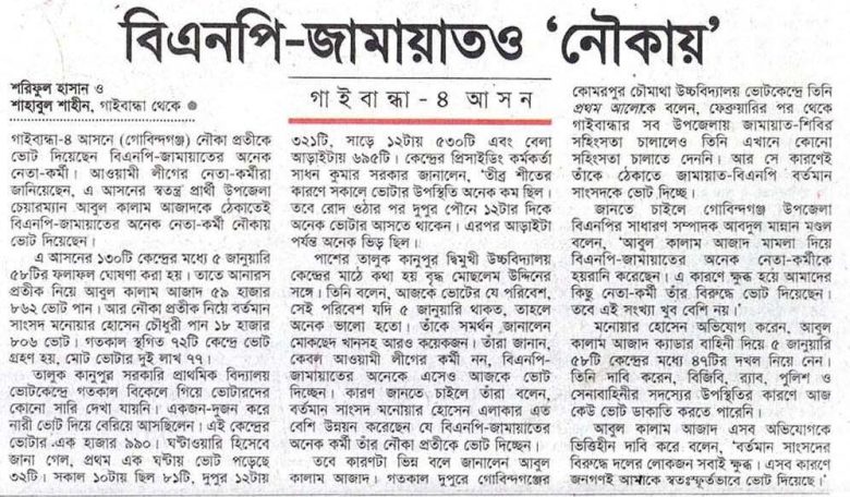 গাইবান্ধা-৪ আসনে (গোবিন্দগঞ্জ) নৌকা প্রতীকে ভোট দিয়েছেন বিএনপি-জামায়াতের অনেক নেতা-কর্মী। আওয়ামী লীগের নেতা-কর্মীরা জানিয়েছেন, এ আসনের স্বতন্ত্র প্রার্থী উপজেলা চেয়ারম্যান আবুল কালাম আজাদকে ঠেকাতেই বিএনপি-জামায়াতের অনেক নেতা-কর্মী নৌকায় ভোট দিয়েছেন।