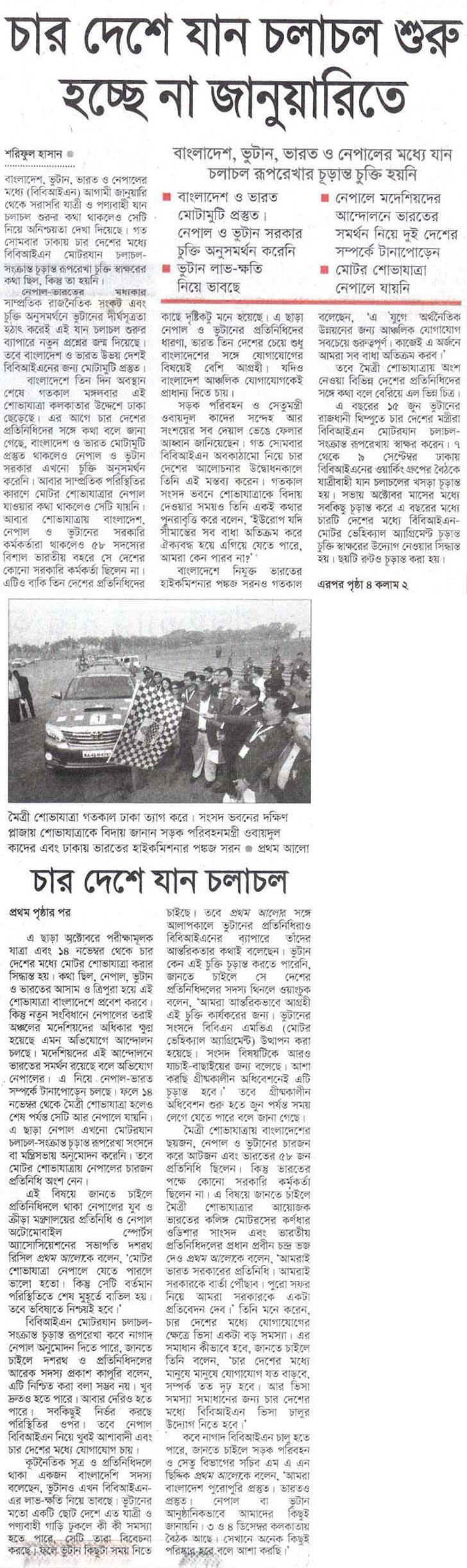 বাংলাদেশে তিন দিন অবস্থান শেষে গতকাল মঙ্গলবার এই শোভাযাত্রা কলকাতার উদ্দেশে ঢাকা ছেড়েছে। এর আগে চার দেশের প্রতিনিধিদের সঙ্গে কথা বলে জানা গেছে, বাংলাদেশ ও ভারত মোটামুটি প্রস্তুত থাকলেও নেপাল ও ভুটান সরকার এখনো চুক্তি অনুসমর্থন করেনি। আবার সাম্প্রতিক পরিস্থিতির কারণে মোটর শোভাযাত্রার নেপাল যাওয়ার কথা থাকলেও সেটি যায়নি। আবার শোভাযাত্রায় বাংলাদেশ, নেপাল ও ভুটানের সরকারি কর্মকর্তারা থাকলেও ৫৮ সদস্যের বিশাল ভারতীয় বহরে সে দেশের কোনো সরকারি কর্মকর্তা ছিলেন না। এটিও বাকি তিন দেশের প্রতিনিধিদের কাছে দৃষ্টিকটু মনে হয়েছে। এ ছাড়া নেপাল ও ভুটানের প্রতিনিধিদের ধারণা, ভারত তিন দেশের চেয়ে শুধু বাংলাদেশের সঙ্গে যোগাযোগের বিষয়েই বেশি আগ্রহী। যদিও বাংলাদেশ আঞ্চলিক যোগাযোগকেই প্রাধান্য দিতে চায়।