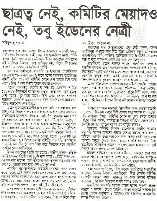 এক দশক ধরে তাঁরা আছেন ইডেন কলেজে। কারোরই ছাত্রত্ব নেই। কমিটির মেয়াদও নেই। তবু তাঁরা ছাত্রলীগের নেত্রী। ভর্তি-বাণিজ্য, সিট দখলসহ নানা অভিযোগ ইডেন কলেজের ছাত্রলীগের এই নেত্রীদের বিরুদ্ধে। শুধু প্রতিপক্ষ নয়, তাঁদের নির্যাতনের কারণে নিজ সংগঠনের নেত্রীরাও অতিষ্ঠ।জেসমিন শামীমাকে সভাপতি ও ফারজানা ইয়াসমিনকে সাধারণ সম্পাদক করে ২০০৬ সালে ইডেন কলেজের ছাত্রলীগের কমিটি গঠিত হয়। এই কমিটির মেয়াদ শেষ হয়েছে তিন বছর আগে। কিন্তু এখনো তাঁরাই ইডেন কলেজ চালাচ্ছেন। ইডেন কলেজের ছাত্রলীগের সভাপতি জেসমিন শামীমা ১৯৯৭-৯৮ শিক্ষাবর্ষে ব্যবস্থাপনা বিভাগে ভর্তি হন। তাঁর ছাত্রত্ব শেষ হয়েছে পাঁচ বছর আগে। তিনি এবং সাধারণ সম্পাদক ফারজানা ইয়াসমিন ১৯৯৯-২০০০ সালে মনোবিজ্ঞানে ভর্তি হন। তাঁরও পড়াশোনা শেষ হয়েছে।ইডেন কলেজের ছাত্রলীগ ও সাধারণ ছাত্রীদের সঙ্গে কথা বলে জানা গেছে, বিএনপি ক্ষমতায় থাকাকালে তাঁরা সেভাবে কলেজের রাজনীতিতে ছিলেন না। কিন্তু আওয়ামী লীগ ক্ষমতায় আসার পর দুই বছর ধরে তাঁরা ভর্তি-বাণিজ্য ও হলে সিট-বাণিজ্য করছেন। অভিযোগ আছে এ কাজে তাঁরা কলেজ কর্তৃপক্ষের সহযোগিতা পান। একাধিক সূত্র নিশ্চিত করেছে, গত বছর টাকার বিনিময়ে এক হাজার এবং এবার প্রায় ৭০০ ছাত্রী ভর্তি করেছেন তাঁরা। এ বছর প্রত্যেক ছাত্রীর কাছ থেকে নেওয়া হয়েছে ৩০ থেকে ৩৫ হাজার টাকা। ছাত্রলীগের কেন্দ্রীয় কমিটির সভাপতি ও সাধারণ সম্পাদককেও তাঁরা ১০ লাখ টাকা করে দিয়েছেন বলে একাধিক ছাত্রলীগ নেতা জানিয়েছেন।ইডেন কলেজের পাঁচটি হল রয়েছে। ছাত্রীরা জানান, প্রতিটি হলেই দুজনের পাঁচটি করে ১০টি কক্ষ আছে। প্রতিটি কক্ষে ২০-২৫ জন করে থাকেন। হলে উঠানোর সময় তাঁদের কাছ থেকে পাঁচ থেকে ১০ হাজার টাকা করে নেন এই দুই নেত্রী।একাধিক সূত্র জানিয়েছে, বর্তমানে খোদেজা বেগম হলের ৩০৩, ৩০৫, ৩১৪, হাসনা বেগম হলের ২০৩, ২১৫, ৩১৪, ৩০৪, আয়েশা সিদ্দিকা হলের ৪১৪, ২০৬, ৩১৩, ২০১০, ৪১৯, জেবুন্নেছা হলের ২০২, ২০৮, ৩০৮, রাজিয়া হলের ১১০, ২১০, ২১১, ২০৯ এবং ৩০৮ নম্বর কক্ষের নিয়ন্ত্রণ এই দুই নেত্রীর হাতে। এসব কক্ষে থাকা ছয়জন ছাত্রী প্রথম আলোকে বলেন, তাঁদের হলে তোলার সময় সাত থেকে ১০ হাজার টাকা নেওয়া হয়। টাকা দিয়েছেন কেন, জানতে চাইলে তাঁরা বলেন, টাকা না দিলে তাঁরা হলে উঠতে পারতেন না।কলেজের ছাত্র ফেডারেশনের এক নেত্রী বলেন, হলের ক্যান্টিনের খাওয়ার মান নিয়ে তাঁরা প্রতিবাদ করায় এ বছরের ফেব্রুয়ারিতে আখি, আরিফা, তানিয়াসহ বাম সংগঠনের মেয়েদের মারধর করে ক্যাম্পাস থেকে বের করে দেন জেসমিন।ছাত্রলীগের ইডেন কলেজ শাখার সাংগঠনিক সম্পাদক শারমিন সুলতানা প্রথম আলোকে বলেন, কলেজের ভর্তি-বাণিজ্য, সিট নিয়ন্ত্রণ থেকে শুরু করে এমন কোনো অপরাধ