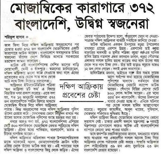 জাল ভিসা নিয়ে দক্ষিণ আফ্রিকায় অনুপ্রবেশের পর গ্রেপ্তার হওয়া ৩৭২ জন বাংলাদেশি মোজাম্বিকের একটি কারাগারে আটক আছেন। বাংলাদেশে অবস্থানরত উদ্বিগ্ন স্বজনেরা তাঁদের দেশে ফিরিয়ে আনতে সরকারের হস্তক্ষেপ কামনা করেছেন।আটক এই বাংলাদেশিদের বেশির ভাগের বাড়ি নোয়াখালী, ফেনী ও চাঁদপুরে। স্বজনেরা জানিয়েছেন, দক্ষিণ অফ্রিকায় ভালো কাজ দেওয়ার কথা বলে এঁদের প্রত্যেকের কাছ থেকে সাত লাখ থেকে আট লাখ টাকা নিয়েছে দালালেরা।আফ্রিকার ইন্টারনেটভিত্তিক পত্রিকা ‘অল আফ্রিকা ডট কম’ এ বিষয়ে বিস্তারিত খবর প্রকাশ করেছে। এতে বলা হয়, গত ১২ জানুয়ারি দালালেরা ৩৭২ জন বাংলাদেশিকে পর্যটন ভিসার মাধ্যমে মোজাম্বিক সীমান্ত দিয়ে দক্ষিণ আফ্রিকায় পাঠায়। কিন্তু অনুপ্রবেশের দায়ে দক্ষিণ আফ্রিকার পুলিশ তাঁদের গ্রেপ্তার করে। সেখানকার জেলে কিছুদিন রাখার পর তাঁদের আবার মোজাম্বিক পুলিশের কাছে হস্তান্তর করা হয়।খবরে আরও বলা হয়, ৩৭২ বাংলাদেশিসহ এশিয়ার মোট ৪০০ নাগরিককে মোজাম্বিকে ফেরত পাঠিয়েছে দক্ষিণ আফ্রিকা। এঁদের মধ্যে পাকিস্তান, বাংলাদেশি, ভারত ও চীনের নাগরিক আছেন।দক্ষিণ আফ্রিকার অভিবাসন শাখার উপমহাপরিচালক জ্যাক ম্যাককেই বলেন, জোহানেসবার্গের ক্রাউন মাইন এরিয়া থেকে তাঁদের আটক করা হয়। এই পাচারের সঙ্গে দক্ষিণ আফ্রিকা ও বাংলাদেশের কিছু লোক জড়িত। এঁদের ফেরত পাঠানোর উদ্দেশ্য হলো, অনুপ্রবেশ মেনে না নেওয়া-সংক্রান্ত দক্ষিণ আফ্রিকার বার্তাটি সবাইকে জানিয়ে দেওয়া।আটক ব্যক্তিদের একজন চাঁদপুরের কচুয়া উপজেলার ধামালুয়া গ্রামের এরশাদ উল্লাহ। এরশাদের ভাই কচুয়া বাজারের ব্যবসায়ী ও স্থানীয় পত্রিকা কচুয়া কণ্ঠ-এর মালিক হাবিব উল্লাহ গতকাল প্রথম আলোকে জানান, কচুয়া পৌরসভা এলাকার দালাল হালিম ভালো কাজের কথা বলে তাঁদের কাছ থেকে সাত লাখ টাকা নেন। তাঁর ভাই ছাড়াও কচুয়ার আরও ১২ জন লোক গেছেন। সবাই এখন কারাগারে।হাবিবউল্লাহ জানান, ভাইয়ের সঙ্গে তাঁর সপ্তাহ দুয়েক আগে সর্বশেষ কথা হয়েছে মোজাম্বিকের পুলিশের মাধ্যমে। বর্তমানে তাঁরা মোজাম্বিকের বোয়ানি ক্যাম্পে আটক আছেন। সেখানে বিভিন্ন দেশের মোট ৯০০ লোক আটক আছেন। এর মধ্যে ৩৫৫ জন বাংলাদেশি। তাঁদের ঠিকমতো খাবার দেওয়া হচ্ছে না। এদিকে ঘটনার পর থেকে দালাল হালিম আত্মগোপনে রয়েছে। কচুয়ার জাহাঙ্গীর, আবুল খায়ের, সুফিয়ান, মোস্তফার পরিবারও দুশ্চিন্তায় আছে।দক্ষিণ আফ্রিকা কিংবা মোজাম্বিকে বাংলাদেশের কোনো দূতাবাস নেই। ঢাকায় প্রবাসী কল্যাণ মন্ত্রণালয় ও পররাষ্ট্র মন্ত্রণালয়ে যোগাযোগ করেও আটক এই বাংলাদেশিদের ব্যাপারে কোনো তথ্য পাওয়া যায়নি।তবে জনশক্তি রপ্তানিকারকেরা জানান, মধ্যপ্রাচ্যে বাজার কমে যাওয়ার পর 