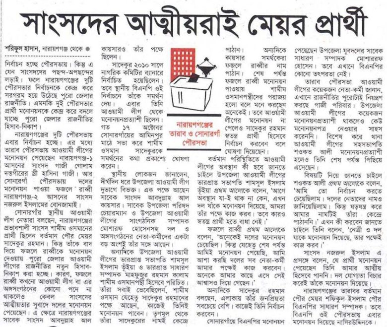 নির্বাচন হচ্ছে পৌরসভায়। কিন্তু এ যেন সাংসদদের পছন্দ-অপছন্দের লড়াই। ফলে নারায়ণগঞ্জের দুটি পৌরসভার নির্বাচনকে কেন্দ্র করে সরগরম হয়ে উঠেছে পুরো জেলার রাজনীতি। এমনকি দুই পৌরসভার প্রার্থী মনোনয়নকে কেন্দ্র করে বদলে যাচ্ছে পুরো জেলার রাজনীতির হিসাব-নিকাশ।