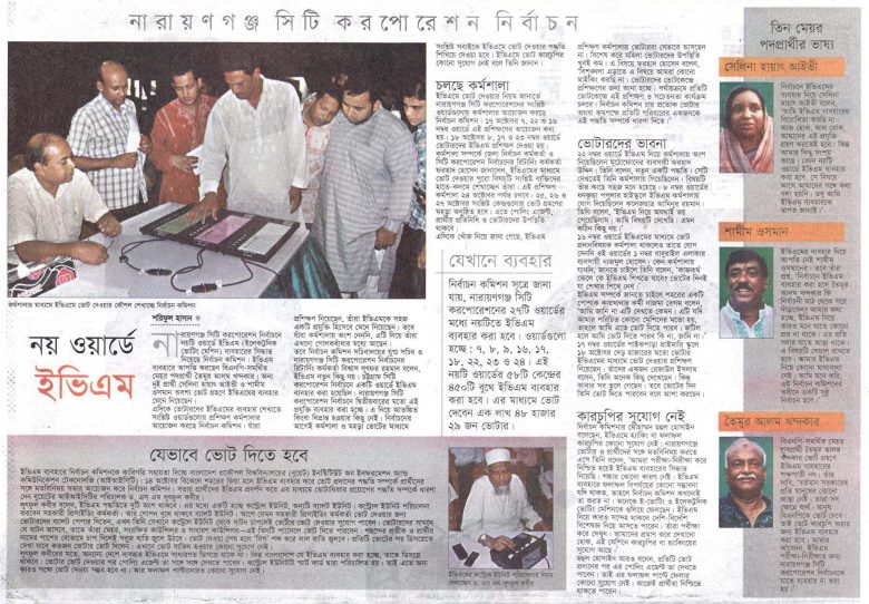 নারায়ণগঞ্জ সিটি করপোরেশন নির্বাচনে নয়টি ওয়ার্ডে ইভিএম (ইলেকট্রনিক ভোটিংমেশিন) ব্যবহারের সিদ্ধান্ত নিয়েছে নির্বাচন কমিশন। ইভিএম ব্যবহারে আপত্তি করছেন বিএনপি-সমর্থিত মেয়র পদপ্রার্থী তৈমুর আলম খন্দকার। অন্য দুই প্রার্থী সেলিনা হায়াৎ আইভী ও শামীম ওসমান অবশ্য ভোট গ্রহণে ইভিএমের ব্যবহার মেনে নিয়েছেন।এদিকে ভোটারদের ইভিএমের ব্যবহার শেখাতে সংশ্লিষ্ট ওয়ার্ডগুলোয় প্রশিক্ষণ কর্মশালার আয়োজন করছে নির্বাচন কমিশন। যাঁরা প্রশিক্ষণ নিয়েছেন, তাঁরা ইভিএমকে সহজ একটি প্রযুক্তি হিসেবে মেনে নিয়েছেন। তবে যাঁরা কর্মশালায় অংশ নেননি, এটি নিয়ে তাঁরা এখনো গোলকধাঁধার মধ্যে আছেন।তবে নির্বাচন কমিশন সচিবালয়ের যুগ্ম সচিব ও নারায়ণগঞ্জ সিটি করপোরেশন নির্বাচনের রিটার্নিং কর্মকর্তা বিশ্বাস লুৎফর রহমান বলেন, ইভিএম নতুন কিছু নয়। চট্টগ্রাম সিটি করপোরেশন নির্বাচনে একটি ওয়ার্ডে ইভিএম ব্যবহার করা হয়েছিল। নারায়ণগঞ্জ সিটি করপোরেশন নির্বাচনে দ্বিতীয়বারের মতো এই প্রযুক্তি ব্যবহার করা হচ্ছে। এ নিয়ে আতঙ্কিত কিংবা বিভ্রান্ত হওয়ার কিছু নেই। নির্বাচনের আগেই কর্মশালা ও মহড়া ভোটের মাধ্যমে সংশ্লিষ্ট সবাইকে ইভিএমে ভোট দেওয়ার পদ্ধতি শিখিয়ে দেওয়া হবে। ইভিএমে ভোট কারচুপির কোনো সুযোগ নেই বলে তিনি জানান।চলছে কর্মশালাইভিএমে ভোট দেওয়ার নিয়ম জানাতে নারায়ণগঞ্জ সিটি করপোরেশনের সংশ্লিষ্ট ওয়ার্ডগুলোয় কর্মশালার আয়োজন করছে নির্বাচন কমিশন। ১৭ অক্টোবর ৭, ২২ ও ১৬ নম্বর ওয়ার্ডে এই প্রশিক্ষণের আয়োজন করা হয়। ১৮ অক্টোবর ৮, ১৭ ও ২৩ নম্বর ওয়ার্ডে ভোটারদের ইভিএম প্রশিক্ষণ দেওয়া হয়।কর্মশালা সম্পর্কে জেলা নির্বাচন কর্মকর্তা ও সিটি করপোরেশন নির্বাচনের রিটার্নিং কর্মকর্তা ফরহাদ হোসেন জানালেন, ইভিএমের মাধ্যমে ভোট দেওয়ার পুরো বিষয়টি সংশ্লিষ্ট ব্যক্তিদের হাতে-কলমে শেখাচ্ছেন তাঁরা। এই প্রশিক্ষণ কর্মশালা ২৪ অক্টোবর পর্যন্ত চলবে। ২৫, ২৬ ও ২৭ অক্টোবর সংশ্লিষ্ট কেন্দ্রগুলোয় ভোট গ্রহণের মহড়া অনুষ্ঠিত হবে। এতে পোলিং এজেন্ট, প্রার্থীর প্রতিনিধি ও ভোটারদের উপস্থিতি থাকবে।এদিকে খোঁজ নিয়ে জানা গেছে, ইভিএম প্রশিক্ষণ কর্মশালায় ভোটাররা সেভাবে আসছেন না। বিশেষ করে মহিলা ভোটারদের উপস্থিতি খুবই কম। এ বিষয়ে ফরহাদ হোসেন বলেন, ‘বিশৃঙ্খলা এড়াতে এ বিষয়ে আমরা কোনো মাইকিং করছি না। ভোটারদের ভোটকেন্দ্রে প্রশিক্ষণের জন্য আনা হচ্ছে। পর্যায়ক্রমে প্রতিটি ভোটকেন্দ্রে এই প্রশিক্ষণ ও সচেতনতা কার্যক্রম চলবে। নির্বাচন কমিশন চায় প্রত্যেক ভোটার অথবা কমপক্ষে প্রতিটি পরিবারের একজনকে এই পদ্ধতি সম্পর্কে ধারণা দিতে।’ভোটারদের ভাবনা২২ নম্বর ওয়ার্ডে ইভিএম নি