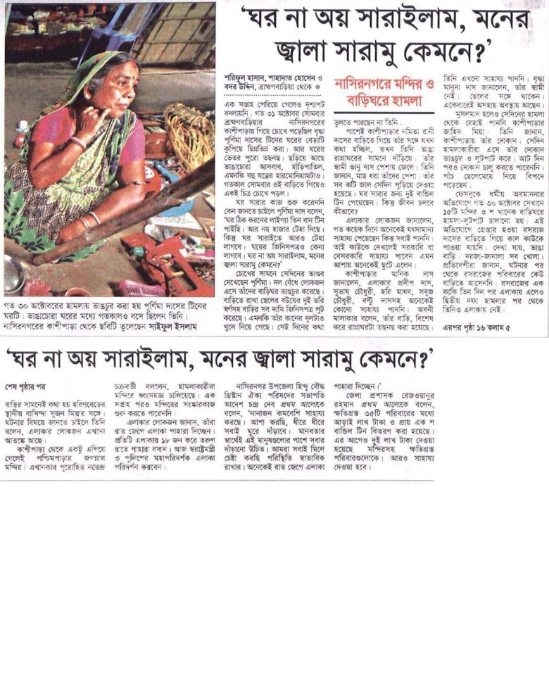 এক সপ্তাহ পেরিয়ে গেলেও দৃশ্যপট বদলায়নি। গত ৩১ অক্টোবর সোমবার ব্রাহ্মণবাড়িয়ার নাসিরনগরের কাশীপাড়ায় গিয়ে চোখে পড়েছিল বৃদ্ধা পূর্ণিমা দাসের টিনের ঘরের বেড়াটি কুপিয়ে ছিন্নভিন্ন করা। আর ঘরের ভেতর পুরো তছনছ। ছড়িয়ে আছে ভাঙাচোরা আসবাব, হাঁড়িপাতিল, এমনকি বহু যত্নের হারমোনিয়ামটাও। গতকাল সোমবার ওই বাড়িতে গিয়েও একই চিত্র চোখে পড়ল।
