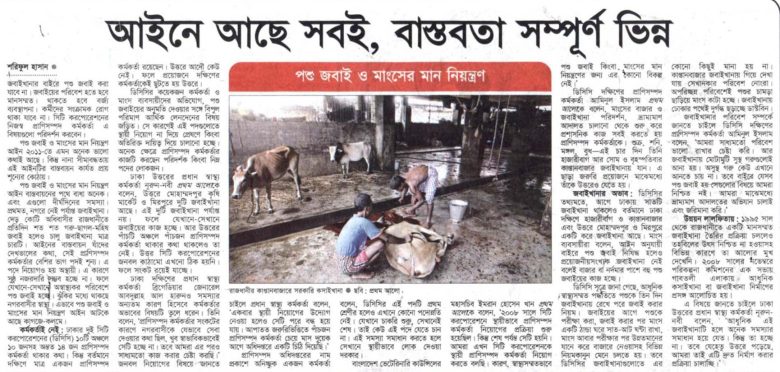 জবাইখানার বাইরে পশু জবাই করা যাবে না। জবাইয়ের পরিবেশ হতে হবে মানসম্মত। থাকতে হবে বর্জ্য ব্যবস্থাপনা। কর্মীদের সংক্রামক রোগ থাকা যাবে না। সিটি করপোরেশনের নিজস্ব প্রাণিসম্পদ কর্মকর্তা এ বিষয়গুলো পরিদর্শন করবেন।পশু জবাই ও মাংসের মান নিয়ন্ত্রণ আইন ২০১১-তে এমন অনেক ভালো কথাই আছে। কিন্তু নানা সীমাবদ্ধতায় এই আইনটির বাস্তবায়ন কার্যত প্রায় শূন্যের কোঠায়।পশু জবাই ও মাংসের মান নিয়ন্ত্রণ আইন বাস্তবায়নের পথে বাধা অনেক। এবং এগুলো দীর্ঘদিনের সমস্যা। প্রথমত, নগরে নেই পর্যাপ্ত জবাইখানা। দেড় কোটি অধিবাসীর রাজধানীতে প্রতিদিন শত শত গরু-ছাগল-মহিষ জবাই হলেও চালু জবাইখানা মাত্র চারটি। আইনের বাস্তবায়ন যাঁদের দেখভালের কথা, সেই প্রাণিসম্পদ কর্মকর্তার বেশির ভাগ পদই শূন্য। এ পদে নিয়োগও হয় অস্থায়ী। এ কারণে সুষ্ঠু নজরদারি সম্ভব হচ্ছে না। ফলে যেখানে-সেখানে অস্বাস্থ্যকর পরিবেশে পশু জবাই হচ্ছে। ঝুঁকির মধ্যে থাকছে নগরবাসীর স্বাস্থ্য। এভাবে পশু জবাই ও মাংসের মান নিয়ন্ত্রণ আইন আটকে আছে কাগজে-কলমে। কর্মকর্তাই নেই: ঢাকার দুই সিটি করপোরেশনের (ডিসিসি) ১০টি অঞ্চলে ১০ জনসহ অন্তত ১৪ জন প্রাণিসম্পদ কর্মকর্তা থাকার কথা। কিন্তু বর্তমানে দক্ষিণে মাত্র একজন প্রাণিসম্পদ কর্মকর্তা রয়েছেন। উত্তরে আদৌ কেউ নেই। ফলে প্রয়োজনে দক্ষিণের কর্মকর্তাকেই ছুটতে হয় উত্তরে।ডিসিসির কয়েকজন কর্মকর্তা ও মাংস ব্যবসায়ীদের অভিযোগ, পশু জবাইয়ের অনুমতি দেওয়ার সঙ্গে বিপুল পরিমাণ আর্থিক লেনদেনের বিষয় জড়িত। সে কারণেই এই পদগুলোতে স্থায়ী নিয়োগ না দিয়ে প্রেষণে কিংবা অতিরিক্ত দায়িত্ব দিয়ে চালানো হচ্ছে। অনেক ক্ষেত্রে প্রাণিসম্পদ কর্মকর্তার কাজটি করছেন পরিদর্শক কিংবা নিম্ন পদের লোকজন।ঢাকা উত্তরের প্রধান স্বাস্থ্য কর্মকর্তা নূরুন-নবী প্রথম আলোকে বলেন, উত্তরে মোহাম্মদপুর কৃষি মার্কেট ও মিরপুরে দুটি জবাইখানা আছে। এই দুটি জবাইখানা পর্যাপ্ত নয়। ফলে যেখানে-সেখানে জবাইয়ের কাজ হচ্ছে। আর উত্তরের পাঁচটি অঞ্চলে পাঁচজন প্রাণিসম্পদ কর্মকর্তা থাকার কথা থাকলেও তা নেই। উত্তর সিটি করপোরেশনের জনবল কাঠামো এখনো ঠিক হয়নি। ফলে সংকট রয়েই যাচ্ছে।ঢাকা দক্ষিণের প্রধান স্বাস্থ্য কর্মকর্তা ব্রিগেডিয়ার জেনারেল আবদুল্লাহ আল হারুনও সমস্যার অন্যতম কারণ হিসেবে কর্মকর্তার অভাবের বিষয়টি তুলে ধরেন। তিনি বলেন, ‘প্রাণিসম্পদ কর্মকর্তার সংকটের কারণে নগরবাসীকে যেভাবে সেবা দেওয়ার কথা ছিল, খুব স্বাভাবিকভাবেই সেটি হচ্ছে না। তবে আমরা এর পরও সাধ্যমতো কাজ করার চেষ্টা করছি।’ জনবল নিয়োগের বিষয়ে জানতে চাইলে প্রধান স্বাস্থ্য কর্মকর্তা বলেন, ‘একবার স্থায়ী নিয়োগের উদ্যোগ নেওয়া হলেও