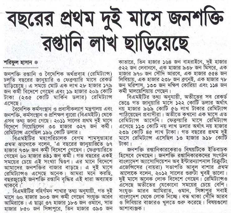 জনশক্তি রপ্তানি ও বৈদেশিক অর্থপ্রবাহ (রেমিট্যান্স) চলতি বছরের জানুয়ারি ও ফেব্রুয়ারি মাসে রেকর্ড ছাড়িয়েছে। এ সময়ে মোট এক লাখ ২৮ হাজার ১৭৯ জন কর্মী বিদেশে গেছেন এবং ১৯ হাজার ২০৯ কোটি টাকা (২৩৫ কোটি মার্কিন ডলার) রেমিট্যান্স এসেছে।বৈদেশিক কর্মসংস্থান ও প্রবাসীকল্যাণ মন্ত্রণালয় এবং জনশক্তি, কর্মসংস্থান ও প্রশিক্ষণ ব্যুরো (বিএমইটি) থেকে এসব তথ্য জানা গেছে। ২০১১ সালের প্রথম দুই মাসে বিদেশে গিয়েছিলেন ৩৩ হাজার ৩২৭ জন কর্মী। রেমিট্যান্স এসেছিল ১৯৬ কোটি ডলার।বিএমইটির মহাপরিচালক বেগম শামসুন্নাহার প্রথম আলোকে বলেন, ‘এ বছরের জানুয়ারিতে ৬৭ হাজার ৭৩৮ জন কর্মী বিদেশে গেছেন। ফেব্রুয়ারিতে গেছেন ৬০ হাজার ৪৪১ জন কর্মী। গত বছরের একই সময়ের চেয়ে এই সংখ্যা দ্বিগুণ। এর মানে বিদেশে আমাদের জনশক্তির বাজার বাড়ছে। এ দুই মাসে রেমিট্যান্সও এসেছে অনেক। আমরা মনে করছি, বছরজুড়েই জনশক্তি রপ্তানি বৃদ্ধির এই ধারা অব্যাহত থাকবে।’বিএমইটির বহির্গমন শাখার তথ্য অনুযায়ী, গত দুই মাসে ৬০ হাজার ৯০৩ জন কর্মী গেছেন সংযুক্ত আরব আমিরাতে। এ ছাড়া ৩৭ হাজার ১৮৩ জন ওমানে, সাত হাজার ৮৫০ জন সিঙ্গাপুরে, তিন হাজার ৩৯৩ জন কাতারে, তিন হাজার ১৬৪ জন বাহরাইনে, দুই হাজার ৫২২ জন লেবাননে, এক হাজার ৯৩৮ জন মিসরে, এক হাজার ৯৭০ জন সৌদি আরবে, এক হাজার ৫৫৪ জন লিবিয়ায়, এক হাজার ২৩৮ জন ব্রুনেই, এক হাজার ৭৮ জন মরিশাস, ১৩৩ জন দক্ষিণ কোরিয়া এবং ১১৪ জন কর্মী মালয়েশিয়ায় গেছেন।বিএমইটির তথ্য অনুযায়ী, অতীতের সব রেকর্ড ভেঙে গত জানুয়ারি মাসে ১২২ কোটি ডলার অর্থাৎ নয় হাজার ৯৬৯ কোটি ৫৬ লাখ টাকার রেমিট্যান্স পাঠিয়েছেন প্রবাসীরা। অতীতে কখনো এক মাসে এত রেমিট্যান্স আসেনি। ফেব্রুয়ারি মাসে রেমিট্যান্স এসেছে ১১৩ কোটি নয় লাখ ডলার অর্থাৎ নয় হাজার ২৩৯ কোটি ৪৫ লাখ টাকা। গত বছরের প্রথম দুই মাসে রেমিট্যান্স এসেছিল ১৩ হাজার ৯১৮ কোটি টাকা।জনশক্তি রপ্তানিকারকেরাও বিষয়টিকে ইতিবাচক হিসেবে দেখছেন। জনশক্তি রপ্তানিকারকদের সংগঠন বাংলাদেশ অ্যাসোসিয়েশন অব ইন্টারন্যাশনাল রিত্রুদ্ধটিং এজেন্সিসের (বায়রা) সভাপতি আবুল বাশার প্রথম আলোকে বলেন, ২০১২ সালের শুরুটা খুবই ভালো। দুই মাসে অনেক লোক বিদেশে গেছেন। রেমিট্যান্সও এসেছে অতীতের যেকোনো সময়ের চেয়ে বেশি। সংযুক্ত আরব আমিরাত, ওমান, সিঙ্গাপুর সবাই বাংলাদেশ থেকে লোক নিচ্ছে। বন্ধ থাকা সৌদি আরব ও লিবিয়ার বাজারও খুলতে শুরু করেছে। বিষয়গুলো আশাব্যঞ্জক।