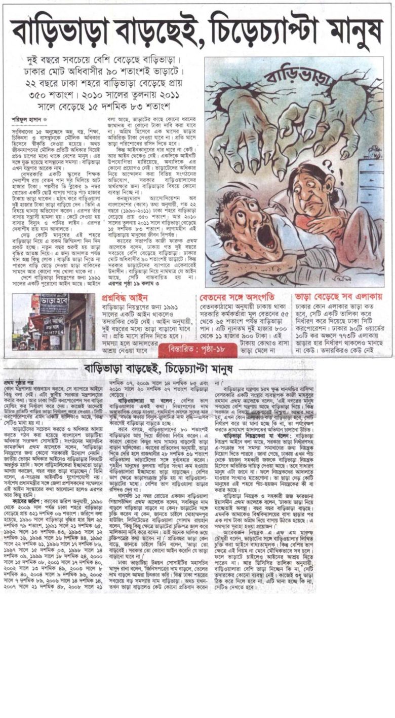 সংবিধানের ১৫ অনুচ্ছেদে অন্ন, বস্ত্র, শিক্ষা, চিকিৎসা ও বাসস্থানকে মৌলিক অধিকার হিসেবে স্বীকৃতি দেওয়া হয়েছে। অথচ জীবনযাপনের মৌলিক প্রতিটি অধিকার নিয়েই প্রচণ্ড চাপের মধ্যে থাকে দেশের মানুষ। এর সঙ্গে যুক্ত হয়েছে বাসস্থানের সমস্যা। বাড়িভাড়া এখন যন্ত্রণার আরেক নাম।বেসরকারি একটি স্কুলের শিক্ষক দেবাশীষ রায় বেতন পান সব মিলিয়ে আট হাজার টাকা। পল্লবীর ডি ব্লকের ৯ নম্বর রোডের একটি ছোট্ট বাসায় সাড়ে পাঁচ হাজার টাকায় ভাড়া থাকেন। হঠাৎ করে বাড়িওয়ালা দুই হাজার টাকা ভাড়া বাড়িয়ে দেন। তিনি এ বিষয়ে থানায় অভিযোগ করেন। এরপর তাঁর বাসায় সন্ত্রাসী হামলা হয়। কেটে দেওয়া হয় বাসার বিদ্যুৎ ও পানির লাইন। এরপর দেবাশীষ রায় যান আদালতে।দেড় কোটি মানুষের এই শহরে বাড়িভাড়া নিয়ে এ রকম জিম্মিদশা দিন দিন প্রকট হচ্ছে। নতুন বছর শুরুই হয় ভাড়া বৃদ্ধির আতঙ্ক দিয়ে। এ জন্য আদালত পর্যন্ত যান অল্প কিছু লোক। বাড়তি ভাড়া দিতে না পারলে বাড়ি ছেড়ে দেওয়া ছাড়া বাকিদের সামনে আর কোনো পথ খোলা থাকে না।দেশে বাড়িভাড়া নিয়ন্ত্রণের জন্য ১৯৯১ সালের একটি পুরোনো আইন আছে। আইনে বলা আছে, ভাড়াটের কাছে কোনো ধরনের জামানত বা কোনো টাকা দাবি করা যাবে না। অগ্রিম হিসেবে এক মাসের ভাড়ার অতিরিক্ত টাকা নেওয়া যাবে না। প্রতি মাসে ভাড়া পরিশোধের রসিদ দিতে হবে।কিন্তু আইনকানুনের ধার ধারে না কেউ। আর আইন থেকেও নেই। একদিকে আইনটি উপযোগিতা হারিয়েছে, অন্যদিকে এর কোনো প্রয়োগও নেই। ভাড়াটেদের অধিকার নিয়ে আন্দোলন করা বিভিন্ন সংগঠনের অভিযোগ, সরকার বাড়িওয়ালাদের স্বার্থরক্ষার জন্য বাড়িভাড়ার বিষয়ে কোনো ব্যবস্থা নিচ্ছে না।কনজ্যুমারস অ্যাসোসিয়েশন অব বাংলাদেশের (ক্যাব) তথ্য অনুযায়ী, গত ২২ বছরে (১৯৯০-২০১১) ঢাকা শহরে বাড়িভাড়া বেড়েছে প্রায় ৩৫০ শতাংশ। আর ২০১০ সালের তুলনায় ২০১১ সালে বাড়িভাড়া বেড়েছে ১৫ দশমিক ৮৩ শতাংশ। লাগামহীন এই বাড়িভাড়ায় মানুষের জীবন বিপর্যস্ত।ক্যাবের সভাপতি কাজী ফারুক প্রথম আলোকে বলেন, ঢাকায় গত দুই বছরে সবচেয়ে বেশি বেড়েছে বাড়িভাড়া। ঢাকার মোট অধিবাসীর ৯০ শতাংশই ভাড়াটে। কিন্তু সরকার ভাড়াটেদের ব্যাপারে একেবারেই উদাসীন। বাড়িভাড়া নিয়ে নামমাত্র যে আইন আছে, সেটি বাস্তবায়িত হয় না। কোন মন্ত্রণালয় বাস্তবায়ন করবে, সে ব্যাপারে আইনে কিছু বলা নেই। এটা স্থানীয় সরকার মন্ত্রণালয়ের করার কথা। আর ঢাকা সিটি করপোরেশন সব বাড়ির হোল্ডিং কর নির্ধারণ করে দেয়। কাজেই তাদেরই উচিত প্রতিটি বাড়ির ভাড়া নির্ধারণ করে দেওয়া। সিটি করপোরেশনের এমন একটি তালিকাও আছে, কিন্তু সেটিও মানা হয় না।ভাড়াটেদের সচেতন করতে ও অধিকার আদায় করতে গঠন করা হয়েছে বাংলাদে
