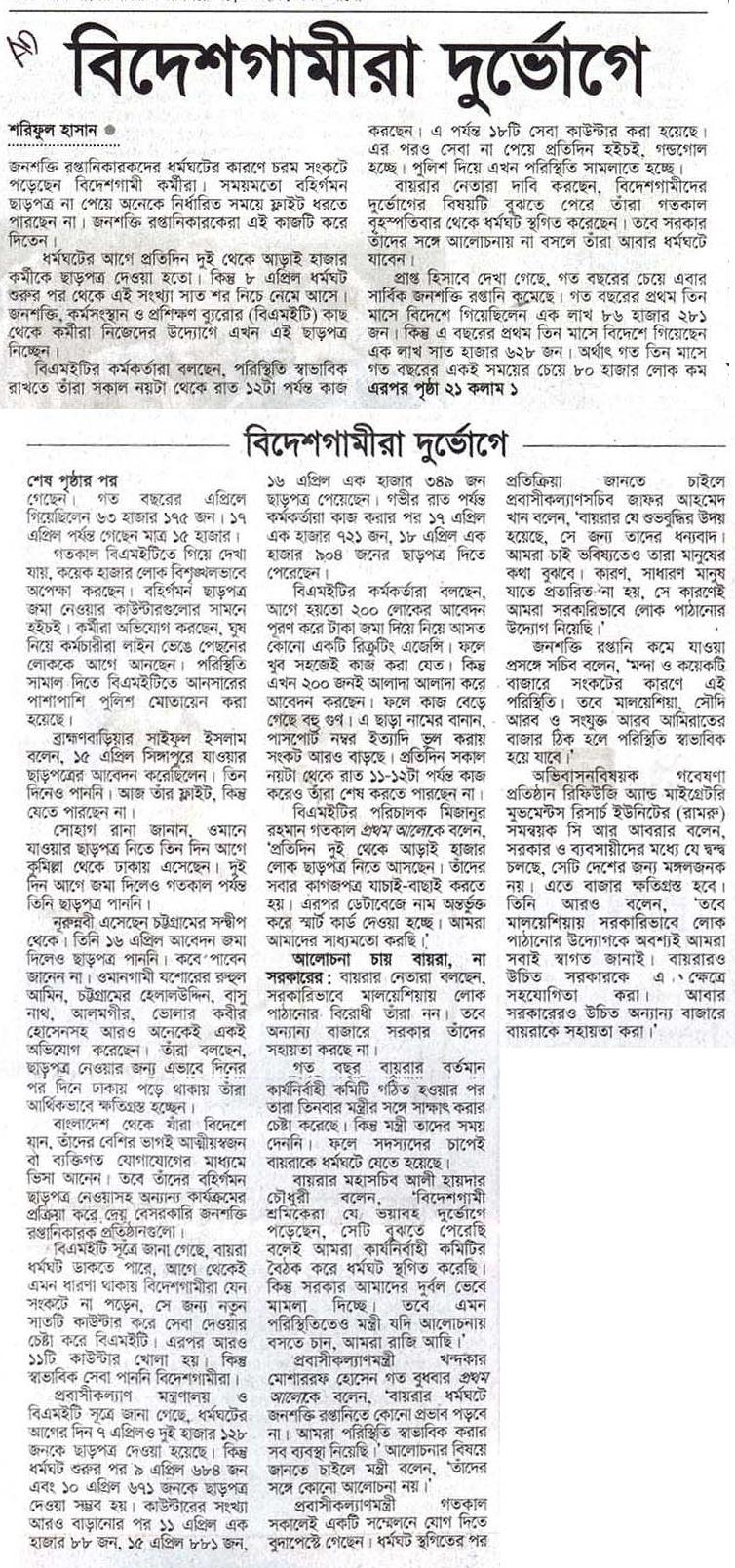জনশক্তি রপ্তানিকারকদের ধর্মঘটের কারণে চরম সংকটে পড়েছেন বিদেশগামী কর্মীরা। সময়মতো বহির্গমন ছাড়পত্র না পেয়ে অনেকে নির্ধারিত সময়ে ফ্লাইট ধরতে পারছেন না। জনশক্তি রপ্তানিকারকেরা এই কাজটি করে দিতেন। ধর্মঘটের আগে প্রতিদিন দুই থেকে আড়াই হাজার কর্মীকে ছাড়পত্র দেওয়া হতো। কিন্তু ৮ এপ্রিল ধর্মঘট শুরুর পর থেকে এই সংখ্যা সাত শর নিচে নেমে আসে। জনশক্তি, কর্মসংস্থান ও প্রশিক্ষণ ব্যুরোর (বিএমইটি) কাছ থেকে কর্মীরা নিজেদের উদ্যোগে এখন এই ছাড়পত্র নিচ্ছেন।বিএমইটির কর্মকর্তারা বলছেন, পরিস্থিতি স্বাভাবিক রাখতে তাঁরা সকাল নয়টা থেকে রাত ১২টা পর্যন্ত কাজ করছেন। এ পর্যন্ত ১৮টি সেবা কাউন্টার করা হয়েছে। এর পরও সেবা না পেয়ে প্রতিদিন হইচই, গন্ডগোল হচ্ছে। পুলিশ দিয়ে এখন পরিস্থিতি সামলাতে হচ্ছে।বায়রার নেতারা দাবি করছেন, বিদেশগামীদের দুর্ভোগের বিষয়টি বুঝতে পেরে তাঁরা গতকাল বৃহস্পতিবার থেকে ধর্মঘট স্থগিত করেছেন। তবে সরকার তাঁদের সঙ্গে আলোচনায় না বসলে তাঁরা আবার ধর্মঘটে যাবেন। প্রাপ্ত হিসাবে দেখা গেছে, গত বছরের চেয়ে এবার সার্বিক জনশক্তি রপ্তানি কমেছে। গত বছরের প্রথম তিন মাসে বিদেশে গিয়েছিলেন এক লাখ ৮৬ হাজার ২৮১ জন। কিন্তু এ বছরের প্রথম তিন মাসে বিদেশে গিয়েছেন এক লাখ সাত হাজার ৬২৮ জন। অর্থাৎ গত তিন মাসে গত বছরের একই সময়ের চেয়ে ৮০ হাজার লোক কম গেছেন। গত বছরের এপ্রিলে গিয়েছিলেন ৬৩ হাজার ১৭৫ জন। ১৭ এপ্রিল পর্যন্ত গেছেন মাত্র ১৫ হাজার।গতকাল বিএমইটিতে গিয়ে দেখা যায়, কয়েক হাজার লোক বিশৃঙ্খলভাবে অপেক্ষা করছেন। বহির্গমন ছাড়পত্র জমা নেওয়ার কাউন্টারগুলোর সামনে হইচই। কর্মীরা অভিযোগ করছেন, ঘুষ নিয়ে কর্মচারীরা লাইন ভেঙে পেছনের লোককে আগে আনছেন। পরিস্থিতি সামাল দিতে বিএমইটিতে আনসারের পাশাপাশি পুলিশ মোতায়েন করা হয়েছে। ব্রাহ্মণবাড়িয়ার সাইফুল ইসলাম বলেন, ১৫ এপ্রিল সিঙ্গাপুরে যাওয়ার ছাড়পত্রের আবেদন করেছিলেন। তিন দিনেও পাননি। আজ তাঁর ফ্লাইট, কিন্তু যেতে পারছেন না। সোহাগ রানা জানান, ওমানে যাওয়ার ছাড়পত্র নিতে তিন দিন আগে কুমিল্লা থেকে ঢাকায় এসেছেন। দুই দিন আগে জমা দিলেও গতকাল পর্যন্ত তিনি ছাড়পত্র পাননি।নূরুন্নবী এসেছেন চট্টগ্রামের সন্দ্বীপ থেকে। তিনি ১৬ এপ্রিল আবেদন জমা দিলেও ছাড়পত্র পাননি। কবে পাবেন জানেন না। ওমানগামী যশোরের রুহুল আমিন, চট্টগ্রামের হেলালউদ্দিন, বাসু নাথ, আলমগীর, ভোলার কবীর হোসেনসহ আরও অনেকেই একই অভিযোগ করেছেন। তাঁরা বলছেন, ছাড়পত্র নেওয়ার জন্য এভাবে দিনের পর দিনে ঢাকায় পড়ে থাকায় তাঁরা আর্থিকভাবে ক্ষতিগ্রস্ত হচ্ছেন।বাংলাদেশ থেকে যাঁরা বিদেশে যান, তাঁদের বেশির ভাগই আত্মীয়স্বজন বা ব্যক্তিগত যোগাযোগের 