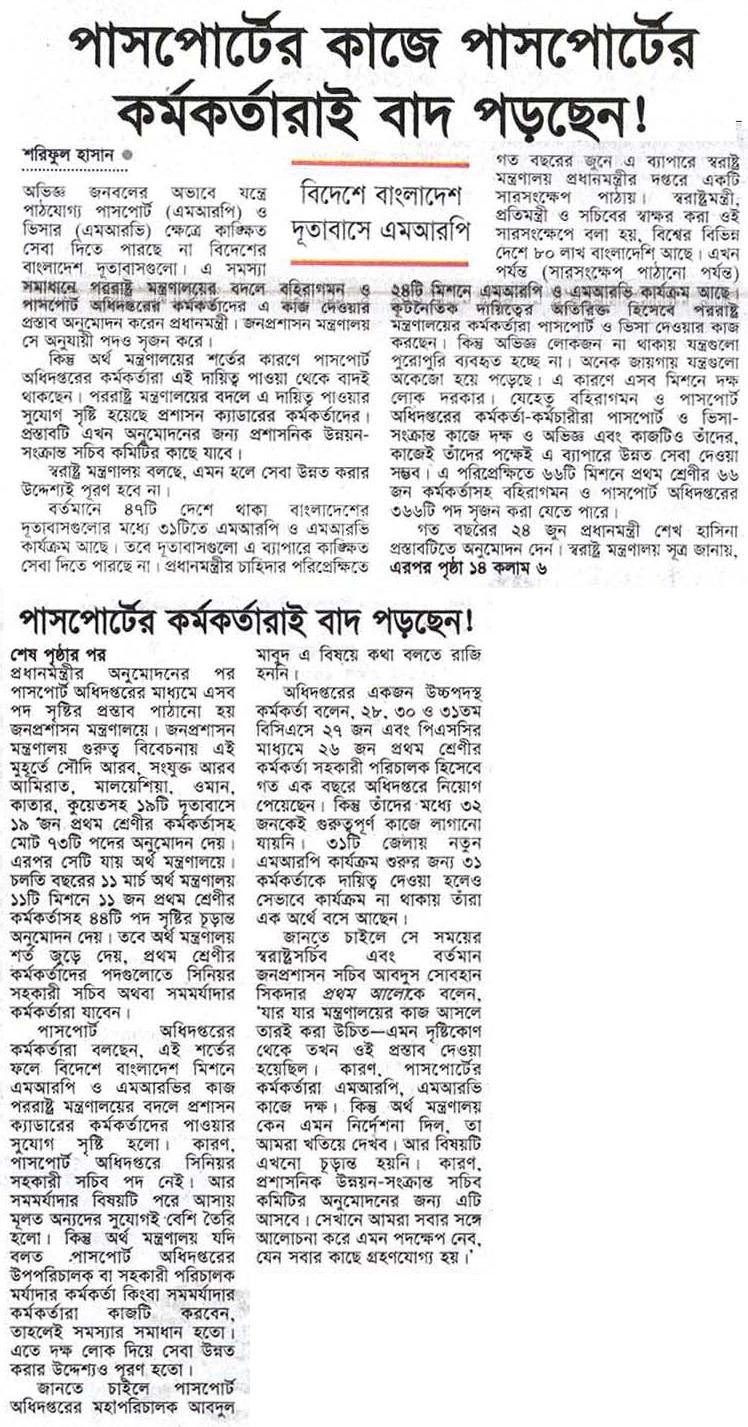অভিজ্ঞ জনবলের অভাবে যন্ত্রে পাঠযোগ্য পাসপোর্ট (এমআরপি) ও ভিসার (এমআরভি) ক্ষেত্রে কাঙ্ক্ষিত সেবা দিতে পারছে না বিদেশের বাংলাদেশ দূতাবাসগুলো। এ সমস্যা সমাধানে পররাষ্ট্র মন্ত্রণালয়ের বদলে বহিরাগমন ও পাসপোর্ট অধিদপ্তরের কর্মকর্তাদের এ কাজ দেওয়ার প্রস্তাব অনুমোদন করেন প্রধানমন্ত্রী। জনপ্রশাসন মন্ত্রণালয় সে অনুযায়ী পদও সৃজন করে।কিন্তু অর্থ মন্ত্রণালয়ের শর্তের কারণে পাসপোর্ট অধিদপ্তরের কর্মকর্তারা এই দায়িত্ব পাওয়া থেকে বাদই থাকছেন। পররাষ্ট্র মন্ত্রণালয়ের বদলে এ দায়িত্ব পাওয়ার সুযোগ সৃষ্টি হয়েছে প্রশাসন ক্যাডারের কর্মকর্তাদের। প্রস্তাবটি এখন অনুমোদনের জন্য প্রশাসনিক উন্নয়ন-সংক্রান্ত সচিব কমিটির কাছে যাবে।স্বরাষ্ট্র মন্ত্রণালয় বলছে, এমন হলে সেবা উন্নত করার উদ্দেশ্যই পূরণ হবে না।বর্তমানে ৪৭টি দেশে থাকা বাংলাদেশের দূতাবাসগুলোর মধ্যে ৩১টিতে এমআরপি ও এমআরভি কার্যক্রম আছে। তবে দূতাবাসগুলো এ ব্যাপারে কাঙ্ক্ষিত সেবা দিতে পারছে না। প্রধানমন্ত্রীর চাহিদার পরিপ্রেক্ষিতে গত বছরের জুনে এ ব্যাপারে স্বরাষ্ট্র মন্ত্রণালয় প্রধানমন্ত্রীর দপ্তরে একটি সারসংক্ষেপ পাঠায়। স্বরাষ্ট্রমন্ত্রী, প্রতিমন্ত্রী ও সচিবের স্বাক্ষর করা ওই সারসংক্ষেপে বলা হয়, বিশ্বের বিভিন্ন দেশে ৮০ লাখ বাংলাদেশি আছে। এখন পর্যন্ত (সারসংক্ষেপ পাঠানো পর্যন্ত) ২৪টি মিশনে এমআরপি ও এমআরভি কার্যক্রম আছে। কূটনৈতিক দায়িত্বের অতিরিক্ত হিসেবে পররাষ্ট্র মন্ত্রণালয়ের কর্মকর্তারা পাসপোর্ট ও ভিসা দেওয়ার কাজ করছেন। কিন্তু অভিজ্ঞ লোকজন না থাকায় যন্ত্রগুলো পুরোপুরি ব্যবহূত হচ্ছে না। অনেক জায়গায় যন্ত্রগুলো অকেজো হয়ে পড়েছে। এ কারণে এসব মিশনে দক্ষ লোক দরকার। যেহেতু বহিরাগমন ও পাসপোর্ট অধিদপ্তরের কর্মকর্তা-কর্মচারীরা পাসপোর্ট ও ভিসা-সংক্রান্ত কাজে দক্ষ ও অভিজ্ঞ এবং কাজটিও তাঁদের, কাজেই তাঁদের পক্ষেই এ ব্যাপারে উন্নত সেবা দেওয়া সম্ভব। এ পরিপ্রেক্ষিতে ৬৬টি মিশনে প্রথম শ্রেণীর ৬৬ জন কর্মকর্তাসহ বহিরাগমন ও পাসপোর্ট অধিদপ্তরের ৩৬৬টি পদ সৃজন করা যেতে পারে।গত বছরের ২৪ জুন প্রধানমন্ত্রী শেখ হাসিনা প্রস্তাবটিতে অনুমোদন দেন। স্বরাষ্ট্র মন্ত্রণালয় সূত্র জানায়, প্রধানমন্ত্রীর অনুমোদনের পর পাসপোর্ট অধিদপ্তরের মাধ্যমে এসব পদ সৃষ্টির প্রস্তাব পাঠানো হয় জনপ্রশাসন মন্ত্রণালয়ে। জনপ্রশাসন মন্ত্রণালয় গুরুত্ব বিবেচনায় এই মুহূর্তে সৌদি আরব, সংযুক্ত আরব আমিরাত, মালয়েশিয়া, ওমান, কাতার, কুয়েতসহ ১৯টি দূতাবাসে ১৯ জন প্রথম শ্রেণীর কর্মকর্তাসহ মোট ৭৩টি পদের অনুমোদন দেয়। এরপর সেটি যায় অর্থ মন্ত্রণালয়ে। চলতি বছরের ১১ মার্চ অর্থ মন্ত্রণালয় ১১টি মিশ