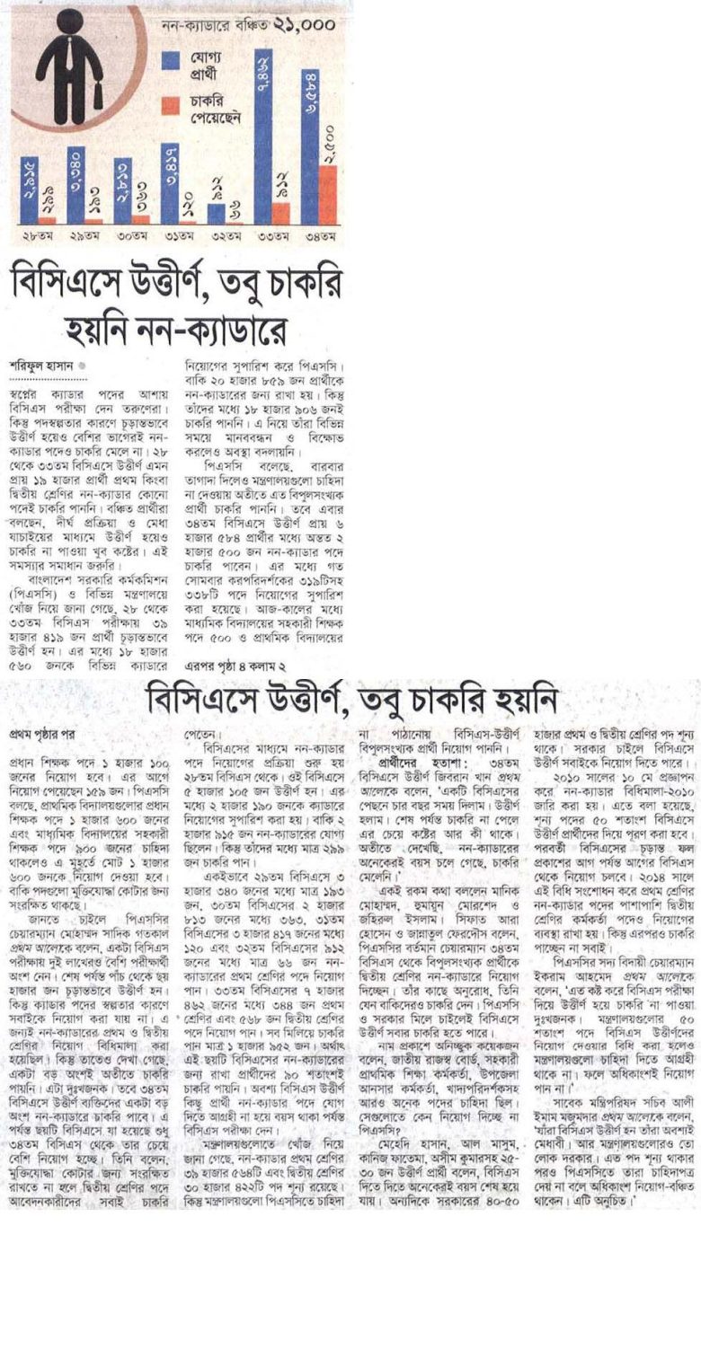 বাংলাদেশ সরকারি কর্মকমিশন (পিএসসি) ও বিভিন্ন মন্ত্রণালয়ে খোঁজ নিয়ে জানা গেছে, ২৮ থেকে ৩৩তম বিসিএস পরীক্ষায় ৩৯ হাজার ৪১৯ জন প্রার্থী চূড়ান্তভাবে উত্তীর্ণ হন। এর মধ্যে ১৮ হাজার ৫৬০ জনকে বিভিন্ন ক্যাডারে নিয়োগের সুপারিশ করে পিএসসি। বাকি ২০ হাজার ৮৫৯ জন প্রার্থীকে নন-ক্যাডারের জন্য রাখা হয়। কিন্তু তাঁদের মধ্যে ১৮ হাজার ৯০৬ জনই চাকরি পাননি। এ নিয়ে তাঁরা বিভিন্ন সময়ে মানববন্ধন ও বিক্ষোভ করলেও অবস্থা বদলায়নি।