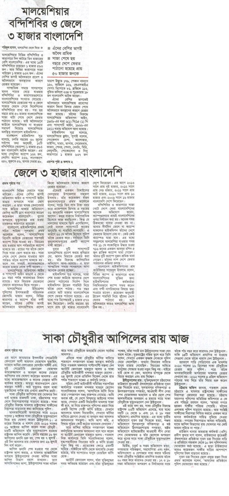 হাইকমিশন সূত্র বলেছে, মালয়েশিয়ার ক্লুয়াং, সুগাই বলোহ, পেংকেলান চেপা, আলোস্তার, তাইপিং, মারাং, তাপাহ, সেরেমবাম, কাজাং, পেনর, পেনাং, বেনটং, মিরি, কেমুনটিং, পোকোসেনা ও সিবু কারাগারে ১ হাজার ৬৩৭ জন বাংলাদেশি বিভিন্ন মেয়াদে সাজা খাটছেন। এঁদের বেশির ভাগই অভিবাসন আইন ও পাসপোর্ট আইন ভাঙার অপরাধে সাজা ভোগ করছেন। এ ছাড়া মাদক কেনাবেচার সঙ্গে জড়িত থাকার অভিযোগে জেলিবু অ্যান্টি ড্রাগ কারাগারে আছেন কয়েকজন বাংলাদেশি। খুনের অপরাধে মৃত্যুদণ্ডের রায় হওয়া চারজনও কারাগারে রয়েছেন।