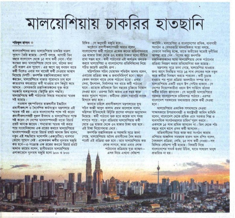 বাংলাদেশিদের জন্য মালয়েশিয়ায় চাকরির দারুণ সুযোগ তৈরি হয়েছে। দেশটি বলছে, আগামী তিন বছরে বাংলাদেশ থেকে ১৫ লাখ কর্মী নেবে। যাঁরা কাজের জন্য মালয়েশিয়ায় যেতে চান, তাঁদের জন্য এটি দারুণ এক সুযোগ। এর আগে শুধু বনায়ন খাতে কর্মী নিলেও এবার সব খাতেই কর্মী নেওয়ার আশ্বাস দিয়েছে দেশটি। জনশক্তি রপ্তানিকারকেরা আশা করছেন, মালয়েশিয়ার বাজার পুরোদমে চালু হলে কাতারসহ মধ্যপ্রাচ্যে কর্মী যাওয়ার চাপ কিছুটা কমে আসবে। বেসরকারি রপ্তানিকারকদের যুক্ত করে সরকারি ব্যবস্থাপনায় (জিটুজি প্লাস পদ্ধতি) মালয়েশিয়ায় কর্মী পাঠানোর বিষয়ে সমঝোতা স্মারক সই হয়েছে।