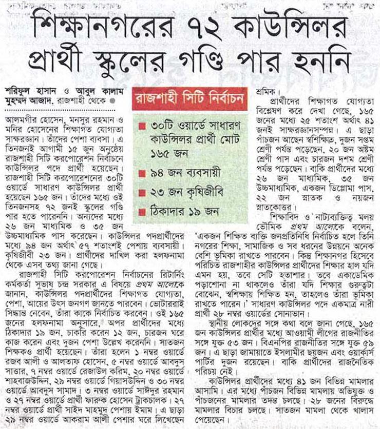 আলমগীর হোসেন, মনসুর রহমান ও মনির হোসেনের শিক্ষাগত যোগ্যতা সাক্ষরজ্ঞান। তাঁদের পেশা ব্যবসা। এ তিনজনই আগামী ১৫ জুন অনুষ্ঠেয় রাজশাহী সিটি করপোরেশন নির্বাচনে কাউন্সিলর পদে প্রার্থী হয়েছেন। রাজশাহী সিটি করপোরেশনের ৩০টি ওয়ার্ডে সাধারণ কাউন্সিলর প্রার্থী হয়েছেন ১৬৫ জন। তাঁদের মধ্যে ওই তিনজনসহ ৭২ জনই স্কুলের গণ্ডি পার হতে পারেননি। অন্যদের মধ্যে ২৬ জন মাধ্যমিক ও ৩৫ জন উচ্চমাধ্যমিক পাস করেছেন। কাউন্সিলর পদপ্রার্থীদের মধ্যে ৯৪ জন অর্থাৎ ৫৭ শতাংশই পেশায় ব্যবসায়ী। কৃষিজীবী ২৩ জন। প্রার্থীদের দাখিল করা হলফনামা থেকে এসব তথ্য জানা গেছে। রাজশাহী সিটি করপোরেশন নির্বাচনের রিটার্নিং কর্মকর্তা সুভাষ চন্দ্র সরকার এ বিষয়ে প্রথম আলোকে জানান, কাউন্সিলর পদপ্রার্থীদের শিক্ষাগত যোগ্যতা, পেশা, আয়ের উৎস জনগণ জানতে পারবেন। ভোটাররাই সিদ্ধান্ত নেবেন, তাঁরা কাকে নির্বাচিত করবেন। ওই ১৬৫ জনের হলফনামা অনুসারে, অপর প্রার্থীদের মধ্যে ঠিকাদার ১৯ জন, চাকরি করেন ১২ জন, চারজন ঘরে কাজ করেন এবং দুজন পেশা উল্লেখ করেননি। সাতজন শিক্ষকও প্রার্থী হয়েছেন। তাঁরা হলেন ১ নম্বর ওয়ার্ডে রজব আলী ও আলতাফ হোসেন, ৫ নম্বর ওয়ার্ডে আবদুস সাত্তার, ৭ নম্বর ওয়ার্ডে রেজাউল করিম, ২০ নম্বর ওয়ার্ডে শাহবাজউদ্দিন, ২৯ নম্বর ওয়ার্ডে গিয়াসউদ্দিন ও ৩০ নম্বর ওয়ার্ডে আবদুস সামাদ। ৩ নম্বর ওয়ার্ডে সাঈদুর রহমান ও ২৭ নম্বর ওয়ার্ডে প্রার্থী ফারুক হোসেন ট্রাকচালক। ২৭ নম্বর ওয়ার্ডে প্রার্থী সাইদ মাহমুদ পেশায় ইমাম। এ ছাড়া ২৯ নম্বর ওয়ার্ডে আকরাম আলী পেশার ঘরে লিখেছেন শ্রমিক।প্রার্থীদের শিক্ষাগত যোগ্যতা বিশ্লেষণ করে দেখা গেছে, ১৬৫ জনের মধ্যে ২৫ শতাংশ অর্থাৎ ৪১ জনই সাক্ষরজ্ঞানসম্পন্ন। এ ছাড়া পাঁচজন আছেন স্বশিক্ষিত, দুজন সপ্তম শ্রেণী পর্যন্ত পড়েছেন, ২০ জন অষ্টম শ্রেণী পাস এবং চারজন দশম শ্রেণী পর্যন্ত পড়েছেন। বাকি প্রার্থীদের মধ্যে ২৬ জন মাধ্যমিক, ৩৫ জন উচ্চমাধ্যমিক, একজন ডিপ্লোমা পাস, ২২ জন স্নাতক ও নয়জন স্নাতকোত্তর। শিক্ষাবিদ ও নাট্যব্যক্তিত্ব মলয় ভৌমিক প্রথম আলোকে বলেন, ‘একজন শিক্ষিত ব্যক্তি জনপ্রতিনিধি নির্বাচিত হলে তিনি নগরের শিক্ষা, সামাজিক ও সব ধরনের উন্নয়নে অনেক বেশি ভূমিকা রাখতে পারবেন। কিন্তু শিক্ষানগর হিসেবে পরিচিত রাজশাহীর কাউন্সিলর প্রার্থীদের শিক্ষার হাল যদি এমন হয়, তবে সেটি হতাশার। তবে একাডেমিক পড়াশোনা না থাকলেও তাঁরা যদি শিক্ষার গুরুত্বটা বোঝেন, স্বশিক্ষায় শিক্ষিত হন, তাহলেও তাঁরা ভূমিকা রাখতে পারেন।’ সাধারণ কাউন্সিলর পদে একমাত্র নারী প্রার্থী ২৮ নম্বর ওয়ার্ডের সোনাভান।স্থানীয় লোকদের সঙ্গে কথা বলে জানা গেছে, ১৬৫ জন কাউন্সিলর প্রার্থীর মধ্যে আওয়া