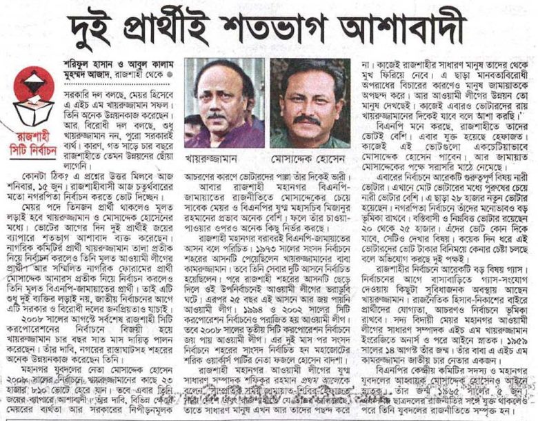 সরকারি দল বলছে, মেয়র হিসেবে এ এইচ এম খায়রুজ্জামান সফল। তিনি অনেক উন্নয়নকাজ করেছেন। আর বিরোধী দল বলছে, শুধু খায়রুজ্জামান নন, পুরো সরকারই ব্যর্থ। কারণ, গত সাড়ে চার বছরে রাজশাহীতে তেমন উন্নয়নের ছোঁয়া লাগেনি। কোনটা ঠিক? এ প্রশ্নের উত্তর মিলবে আজ শনিবার, ১৫ জুন। রাজশাহীবাসী আজ চতুর্থবারের মতো নগরপিতা নির্বাচন করতে ভোট দিচ্ছেন। মেয়র পদে তিনজন প্রার্থী থাকলেও মূলত লড়াই হবে খায়রুজ্জামান ও মোসাদ্দেক হোসেনের মধ্যে। ভোটের আগের দিন দুই প্রার্থীই জয়ের ব্যাপারে শতভাগ আশাবাদ ব্যক্ত করেছেন। নাগরিক কমিটির প্রার্থী খায়রুজ্জামান তালা প্রতীক নিয়ে নির্বাচন করলেও তিনি মূলত আওয়ামী লীগের প্রার্থী। আর সম্মিলিত নাগরিক ফোরামের প্রার্থী মোসাদ্দেক আনারস প্রতীক নিয়ে নির্বাচন করলেও তিনি মূলত বিএনপি-জামায়াতের প্রার্থী। তাই এটি শুধু দুই ব্যক্তির লড়াই নয়, জাতীয় নির্বাচনের আগে এটি সরকার ও বিরোধী দলের জনপ্রিয়তাও যাচাই। ২০০৮ সালের আগস্টে সর্বশেষ রাজশাহী সিটি করপোরেশনের নির্বাচনে বিজয়ী হয়ে খায়রুজ্জামান চার বছর সাত মাস দায়িত্ব পালন করেছেন। তাঁর দাবি, নগরের রাস্তাঘাটসহ শহরের অনেক উন্নয়নকাজ করেছেন তিনি। মহানগর যুবদলের নেতা মোসাদ্দেক হোসেন ২০০৮ সালের নির্বাচনে খায়রুজ্জামানের কাছে ২৩ হাজার ৮১০ ভোটে হেরে যান। তবে এবার তিনি জয়ের ব্যাপারে আশাবাদী। তাঁর দাবি, বিভিন্ন ক্ষেত্রে মেয়রের ব্যর্থতা আর সরকারের নিপীড়নমূলক আচরণের কারণে ভোটারদের পাল্লা তাঁর দিকেই ভারী। আবার রাজশাহী মহানগর বিএনপি-জামায়াতের রাজনীতিতে মোসাদ্দেকের চেয়ে সাবেক মেয়র ও বিএনপির যুগ্ম মহাসচিব মিজানুর রহমানের প্রভাব অনেক বেশি। ফলে তাঁর চাওয়া-পাওয়ার ওপরও অনেক কিছু নির্ভর করছে।রাজশাহী মহানগর বরাবরই বিএনপি-জামায়াতের আসন বলে পরিচিত। ১৯৭৩ সালের সংসদ নির্বাচনে শহরের আসনটি পেয়েছিলেন খায়রুজ্জামানের বাবা কামরুজ্জামান। তবে তিনি সেবার দুটি আসনে নির্বাচিত হয়েছিলেন। পরে রাজশাহী শহরের আসনটি ছেড়ে দিলে ওই উপনির্বাচনেই আওয়ামী লীগের ভরাডুবি ঘটে। এরপর ২৫ বছর এই আসনে আর জয় পায়নি আওয়ামী লীগ। ১৯৯৪ ও ২০০২ সালের সিটি করপোরেশন নির্বাচনেও পরাজিত হয় আওয়ামী লীগ। তবে ২০০৮ সালের তৃতীয় সিটি করপোরেশন নির্বাচনে জয় পায় আওয়ামী লীগ। এর দুই মাস পর সংসদ নির্বাচনে শহরের সাংসদ নির্বাচিত হন মহাজোটের শরিক ওয়ার্কার্স পার্টির নেতা ফজলে হোসেন বাদশা। রাজশাহী মহানগর আওয়ামী লীগের যুগ্ম সাধারণ সম্পাদক শফিকুর রহমান প্রথম আলোকে বলেন, ‘সাম্প্রতিক সময় জামায়াত-শিবির-হেফাজত সারা দেশে এবং রাজশাহীতে যে তাণ্ডব চালিয়েছে, তাতে সাধারণ মানুষ এখন আর তাদের পছন্দ করে না। কাজেই রাজশাহীর সা