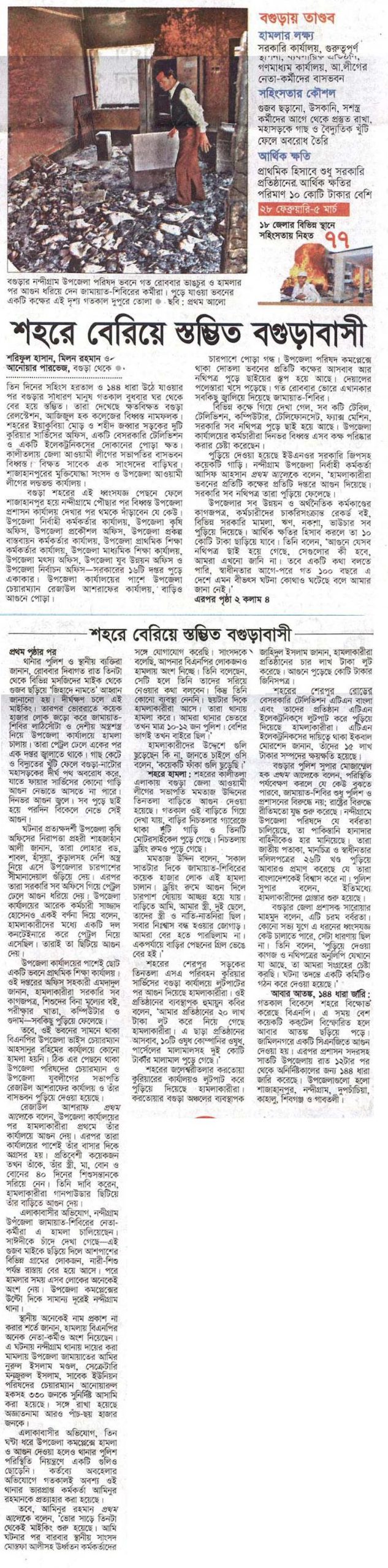 তিন দিনের সহিংস হরতাল ও ১৪৪ ধারা উঠে যাওয়ার পর বগুড়ার সাধারণ মানুষ গতকাল বুধবার ঘর থেকে বের হয়ে স্তম্ভিত। তারা দেখেছে ক্ষতবিক্ষত বগুড়া রেলস্টেশন, আজিজুল হক কলেজের বিধ্বস্ত নামফলক। শহরের ইয়াকুবিয়া মোড় ও শহীদ জব্বার সড়কের দুটি কুরিয়ার সার্ভিসের অফিস, একটি বেসরকারি টেলিভিশন ও একটি ইলেকট্রনিকসের দোকানের পোড়া ক্ষত। কালীতলায় জেলা আওয়ামী লীগের সভাপতির বাসভবন বিধ্বস্ত। বিক্ষত সাবেক এক সাংসদের বাড়িঘর। শাজাহানপুরের মুক্তিযোদ্ধা সংসদ ও উপজেলা আওয়ামী লীগের লন্ডভন্ড কার্যালয়। বগুড়া শহরের এই ধ্বংসযজ্ঞ পেছনে ফেলে শাজাহানপুর হয়ে নন্দীগ্রামে পৌঁছার পর বিধ্বস্ত উপজেলা প্রশাসন কার্যালয় দেখার পর থমকে দাঁড়াবেন যে কেউ। উপজেলা নির্বাহী কর্মকর্তার কার্যালয়, উপজেলা কৃষি অফিস, উপজেলা প্রকৌশল অফিস, উপজেলা প্রকল্প বাস্তবায়ন কর্মকর্তার কার্যালয়, উপজেলা প্রাথমিক শিক্ষা কর্মকর্তার কার্যালয়, উপজেলা মাধ্যমিক শিক্ষা কার্যালয়, উপজেলা মৎস্য অফিস, উপজেলা যুব উন্নয়ন অফিস ও উপজেলা নির্বাচন অফিস—সরকারের ১৬টি দপ্তর পুড়ে একাকার। উপজেলা কার্যালয়ের পাশে উপজেলা চেয়ারম্যান রেজাউল আশরাফের কার্যালয়, বাড়িও আগুনে পোড়া।চারপাশে পোড়া গন্ধ। উপজেলা পরিষদ কমপ্লেক্সে থাকা দোতলা ভবনের প্রতিটি কক্ষের আসবাব আর নথিপত্র পুড়ে ছাইয়ের স্তূপ হয়ে আছে। দেয়ালের পলেস্তারা খসে পড়েছে। গত রোববার ভোরে এখানকার সবকিছু জ্বালিয়ে দিয়েছে জামায়াত-শিবির। বিভিন্ন কক্ষে গিয়ে দেখা গেল, সব কটি টেবিল, টেলিভিশন, কম্পিউটার, টেলিফোনসেট, ফ্যাক্স মেশিন, সরকারি সব নথিপত্র পুড়ে ছাই হয়ে আছে। উপজেলা কার্যালয়ের কর্মচারীরা দিনভর বিধ্বস্ত এসব কক্ষ পরিষ্কার করার চেষ্টা করেছেন। পুড়িয়ে দেওয়া হয়েছে ইউএনওর সরকারি জিপসহ কয়েকটি গাড়ি। নন্দীগ্রাম উপজেলা নির্বাহী কর্মকর্তা আসিফ আহসান প্রথম আলোকে বলেন, ‘হামলাকারীরা ভবনের প্রতিটি কক্ষের প্রতিটি দপ্তরে আগুন দিয়েছে। সরকারি সব নথিপত্র তারা পুড়িয়ে ফেলেছে। উপজেলার সব উন্নয়ন ও অর্থনৈতিক কর্মকাণ্ডের কাগজপত্র, কর্মচারীদের চাকরিসংক্রান্ত রেকর্ড বই, বিভিন্ন সরকারি মামলা, ঋণ, নকশা, ভাউচার সব পুড়িয়ে দিয়েছে। আর্থিক ক্ষতির হিসাব করলে তা ১০ কোটি টাকা ছাড়িয়ে যাবে। তিনি বলেন, ‘আগুনে যেসব নথিপত্র ছাই হয়ে গেছে, সেগুলোর কী হবে, আমরা এখনো জানি না। তবে একটি কথা বলতে পারি, স্বাধীনতার আগে-পরে গত ১০০ বছরে এ দেশে এমন বীভৎস ঘটনা কোথাও ঘটেছে বলে আমার জানা নেই।’থানার পুলিশ ও স্থানীয় ব্যক্তিরা জানান, রোববার দিবাগত রাত তিনটা থেকে বিভিন্ন মসজিদের মাইক থেকে গুজব ছড়িয়ে ‘জিহাদে নামতে’ আহ্বান জানানো হয়। দীর্ঘক্ষণ চলে এই মাইকিং। 