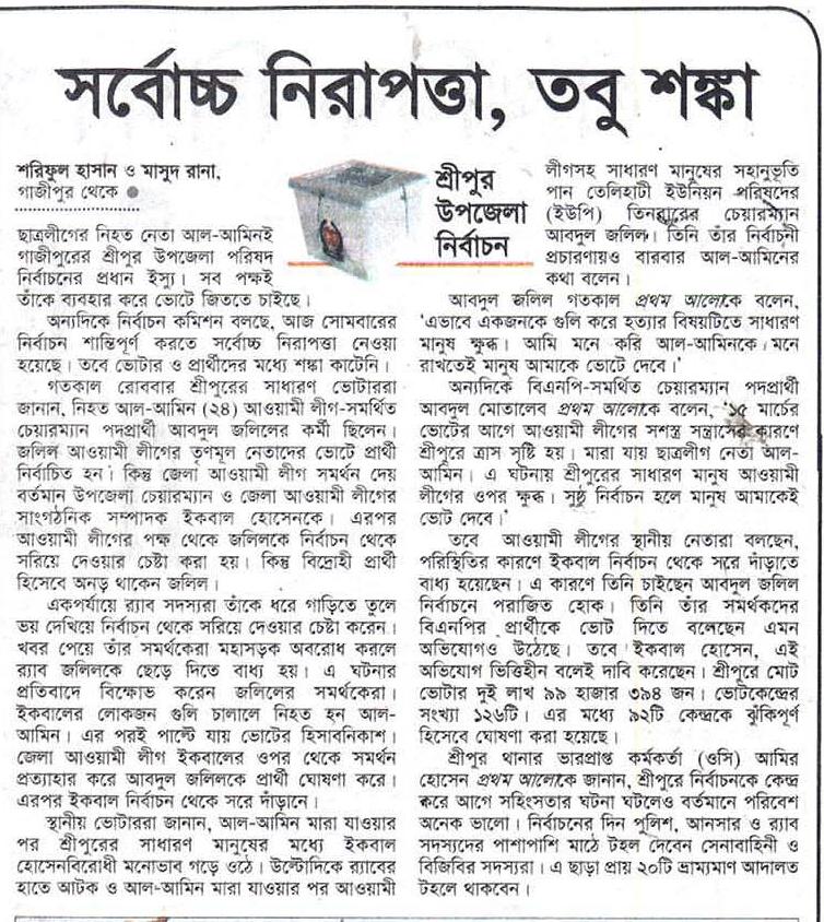 ছাত্রলীগের নিহত নেতা আল-আমিনই গাজীপুরের শ্রীপুর উপজেলা পরিষদ নির্বাচনের প্রধান ইস্যু। সব পক্ষই তাঁকে ব্যবহার করে ভোটে জিততে চাইছে।