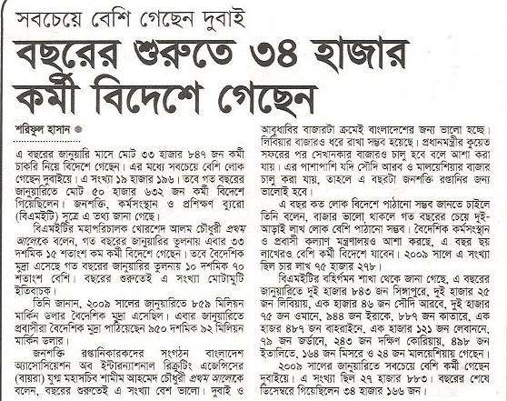 এ বছরের জানুয়ারি মাসে মোট ৩৩ হাজার ৮৪৭ জন কর্মী চাকরি নিয়ে বিদেশে গেছেন। এর মধ্যে সবচেয়ে বেশি লোক গেছেন দুবাইয়ে। এ সংখ্যা ১৯ হাজার ১৯৬। তবে গত বছরের জানুয়ারিতে মোট ৫০ হাজার ৬৩২ জন কর্মী বিদেশে গিয়েছিলেন। জনশক্তি, কর্মসংস্থান ও প্রশিক্ষণ ব্যুরো (বিএমইটি) সূত্রে এ তথ্য জানা গেছে।বিএমইটির মহাপরিচালক খোরশেদ আলম চৌধুরী প্রথম আলোকে বলেন, গত বছরের জানুয়ারির তুলনায় এবার ৩৩ দশমিক ১৫ শতাংশ কম কর্মী বিদেশে গেছেন। তবে বৈদেশিক মুদ্রা এসেছে গত বছরের জানুয়ারির তুলনায় ১০ দশমিক ৭০ শতাংশ বেশি। বছরের শুরুতেই এ সংখ্যা মোটামুটি ইতিবাচক।তিনি জানান, ২০০৯ সালের জানুয়ারিতে ৮৫৯ মিলিয়ন মার্কিন ডলার বৈদেশিক মুদ্রা এসেছিল। এবার জানুয়ারিতে প্রবাসীরা বৈদেশিক মুদ্রা পাঠিয়েছেন ৯৫০ দশমিক ৯২ মিলিয়ন মার্কিন ডলার।জনশক্তি রপ্তানিকারকদের সংগঠন বাংলাদেশ অ্যাসোসিয়েশন অব ইন্টারন্যাশনাল রিক্রুটিং এজেন্সিসের (বায়রা) যুগ্ম মহাসচিব শামীম আহমেদ চৌধুরী প্রথম আলোকে বলেন, বছরের শুরুতেই এ সংখ্যা বেশ ভালো। দুবাই ও আবুধাবির বাজারটা ক্রমেই বাংলাদেশের জন্য ভালো হচ্ছে। লিবিয়ার বাজারও ধরে রাখা সম্ভব হয়েছে। প্রধানমন্ত্রীর কুয়েত সফরের পর সেখানকার বাজারও চালু হবে বলে আশা করা যায়। এর পাশাপাশি যদি সৌদি আরব ও মালয়েশিয়ার বাজার চালু করা যায়, তাহলে এ বছরটা জনশক্তি রপ্তানির জন্য ভালোই হবে।এ বছর কত লোক বিদেশে পাঠানো সম্ভব জানতে চাইলে তিনি বলেন, বাজার ভালো থাকলে গত বছরের চেয়ে দুই-আড়াই লাখ লোক বেশি পাঠানো সম্ভব। বৈদেশিক কর্মসংস্থান ও প্রবাসী কল্যাণ মন্ত্রণালয়ও আশা করছে, এ বছর ছয় লাখেরও বেশি কর্মী বিদেশে যাবেন। ২০০৯ সালে এ সংখ্যা ছিল চার লাখ ৭৫ হাজার ২৭৮।বিএমইটির বহির্গমন শাখা থেকে জানা গেছে, এ বছরের জানুয়ারিতে দুই হাজার ৮৪৩ জন সিঙ্গাপুরে, দুই হাজার ২৫ জন লিবিয়ায়, এক হাজার ৪৬ জন সৌদি আরবে, দুই হাজার ৭৫ জন ওমানে, ৯৪৪ জন ইরাকে, ৮৮৭ জন কাতারে, এক হাজর ৪৮৭ জন বাহরাইনে, এক হাজার ১২১ জন লেবাননে, ৭৯ জন জর্ডানে, ২৪৩ জন দক্ষিণ কোরিয়ায়, ৪৯৮ জন ইতালিতে, ১৬৪ জন মিসরে ও ২৪ জন মালয়েশিয়ায় গেছেন।২০০৯ সালের জানুয়ারিতে সবচেয়ে বেশি কর্মী গেছেন দুবাইয়ে। এ সংখ্যা ছিল ২৭ হাজার ৮৮৩। বছরের শেষে ডিসেম্বরে গিয়েছিলেন ৩৪ হাজার ১৬৬ জন।