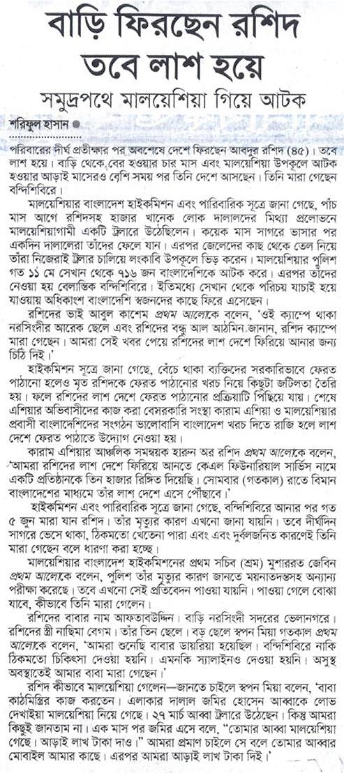 মালয়েশিয়ার বাংলাদেশ হাইকমিশন এবং পারিবারিক সূত্রে জানা গেছে, পাঁচ মাস আগে রশিদসহ হাজার খানেক লোক দালালদের মিথ্যা প্রলোভনে মালয়েশিয়াগামী একটি ট্রলারে উঠেছিলেন। কয়েক মাস সাগরে ভাসার পর একদিন দালালেরা তাঁদের ফেলে যান। এরপর জেলেদের কাছ থেকে তেল নিয়ে তাঁরা নিজেরাই ট্রলার চালিয়ে লংকাবি উপকূলে ভিড় করেন। মালয়েশিয়ার পুলিশ গত ১১ মে সেখান থেকে ৭১৬ জন বাংলাদেশিকে আটক করে। এরপর তাঁদের নেওয়া হয় বেলান্তিক বন্দিশিবিরে। ইতিমধ্যে সেখান থেকে পরিচয় যাচাই হয়ে যাওয়ায় অধিকাংশ বাংলাদেশি স্বজনদের কাছে ফিরে এসেছেন।