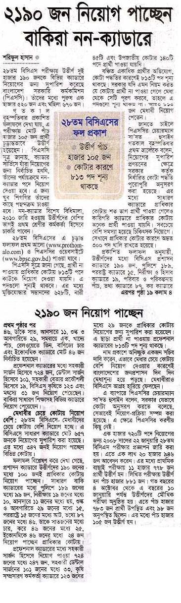 ২৮তম বিসিএস পরীক্ষায় উত্তীর্ণ দুই হাজার ১৯০ জনকে বিভিন্ন ক্যাডারে নিয়োগের জন্য সুপারিশ করেছে বাংলাদেশ সরকারি কর্মকমিশন (পিএসসি)। তাঁদের মধ্যে পুরুষ এক হাজার ৫২০ জন এবং মহিলা ৬৭০ জন। ফলাফল জানতে এখানে ক্লিক করুনগতকাল বৃহস্পতিবার প্রকাশিত ফলাফলে দেখা যায়, এ পরীক্ষায় মোট পাঁচ হাজার ১০৫ জন প্রার্থী চূড়ান্তভাবে উত্তীর্ণ হয়েছেন। পিএসসি সূত্র জানায়, ক্যাডার সার্ভিসে যাঁরা নিয়োগের জন্য নির্বাচিত হননি, তাঁদের পর্যায়ক্রমে নন-ক্যাডার পদে নিয়োগ দেওয়া হবে। এ জন্য খুব শিগগির তাঁদের কাছে পছন্দক্রম চাওয়া হবে। নন-ক্যাডার বিশেষ বিধিমালা, ২০১০ জারি হওয়ায় উত্তীর্ণদের বেশির ভাগই প্রথম শ্রেণীর কর্মকর্তা হিসেবে চাকরি পাবেন।২৮তম বিসিএসের এ চূড়ান্ত ফলাফল প্রথম আলো (www.prothom-alo.com) ও পিএসসির ওয়েবসাইটে (www.bpsc.gov.bd) পাওয়া যাবে।পিএসসি সূত্রে জানা গেছে, প্রার্থী না পাওয়ায় প্রাধিকার কোটায় ৮১৩টি পদে কাউকে নিয়োগ দেওয়া যায়নি। এ পদগুলো শূন্যই থাকবে। এর মধ্যে মুক্তিযোদ্ধার সন্তানদের ৬২৮টি, নারী ৪৫টি এবং উপজাতীয় কোটার ১৪০টি পদে প্রার্থী পাওয়া যায়নি। বঞ্চিত একাধিক প্রার্থীর অভিযোগ, কোটা পদ্ধতির কারণেই ৮১৩টি পদ শূন্য থাকছে। সরকার যদি এমন নিয়ম করত যে কোটায় প্রার্থী না পাওয়া গেলে মেধা থেকে সেটি পূরণ করবে, তাহলে এ পদগুলো শূন্য থাকত না। আরও ৮১৩ জন মেধাবী নিয়োগ পেতেন। জানতে চাইলে পিএসসির চেয়ারম্যান সা’দত হুসাইন গতকাল বৃহস্পতিবার প্রথম আলোকে বলেন, নিয়োগের সুপারিশ প্রণয়নের ক্ষেত্রে সরকার কর্তৃক নির্ধারিত কোটা পদ্ধতি পুরোপুরি অনুসরণ করা হয়েছে। এর মধ্যে সাধারণ ক্যাডারে প্রাধিকার কোটায় শত ভাগ প্রার্থী পাওয়া গেলেও কারিগরি ক্যাডারে প্রাধিকার কোটায় অনেক প্রার্থী পাওয়া যায়নি। সবচেয়ে বেশি সমস্যা হয়েছে চিকিৎসক নিয়োগে। সেখানে প্রাধিকার কোটার কারণে অন্তত ৩০০ পদ খালি রাখতে হয়েছে।প্রকাশিত ফলাফল অনুযায়ী, উত্তীর্ণদের মধ্যে বিসিএস প্রশাসন ক্যাডারে ১৯০ জন, পুলিশে ১৮৯, পররাষ্ট্র ক্যাডারে ১৫, নিরীক্ষা ও হিসাব ক্যাডারে ১৯, পরিবার ও পরিকল্পনায় পাঁচ, তথ্য ক্যাডারে ৮৭, কর ক্যাডারে ৪৬, ডাকে সাত, আনসারে ১১, শুল্ক ও আবগারিতে ২৯, সমবায়ে এক, খাদ্যে পাঁচ, রেলওয়েতে তিন, বাণিজ্যে চার এবং ইকোনমিক ক্যাডারে মোট ৪৬ জন নির্বাচিত হয়েছেন। প্রফেশনাল ক্যাডারের মধ্যে সহকারী সার্জন হিসেবে ৭২৪ জন, ডেন্টাল সার্জন হিসেবে ১০১, সহকারী বেতার প্রকৌশলী হিসেবে ১৯, বিসিএস কৃষিতে ১২৩ এবং মৎস্যে ৩১ জন নিয়োগ পেয়েছেন। বাকিরা সাধারণ শিক্ষাসহ বিভিন্ন ক্যাডারে নিয়োগ পেয়েছেন। মেধাবীর চেয়ে কোটায় নিয়োগ বেশি: ২৮তম বিসিএসে মেধাবীদের চেয়ে কোটায় বেশি নিয়োগ হচ্ছে। এ বিসিএসে 