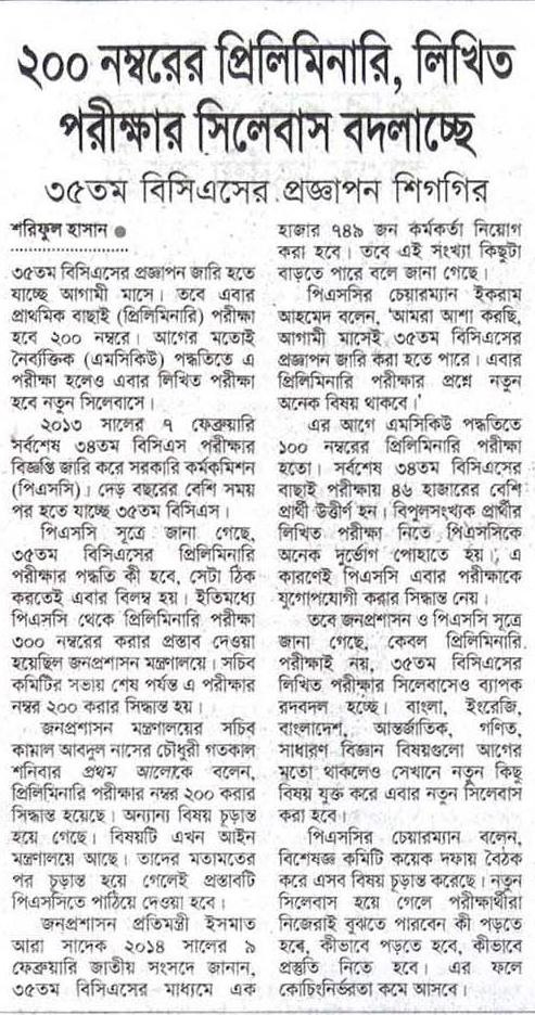 ২০১৩ সালের ৭ ফেব্রুয়ারি সর্বশেষ ৩৪তম বিসিএস পরীক্ষার বিজ্ঞপ্তি জারি করে সরকারি কর্মকমিশন (পিএসসি)। দেড় বছরের বেশি সময় পর হতে যাচ্ছে ৩৫তম বিসিএসের।