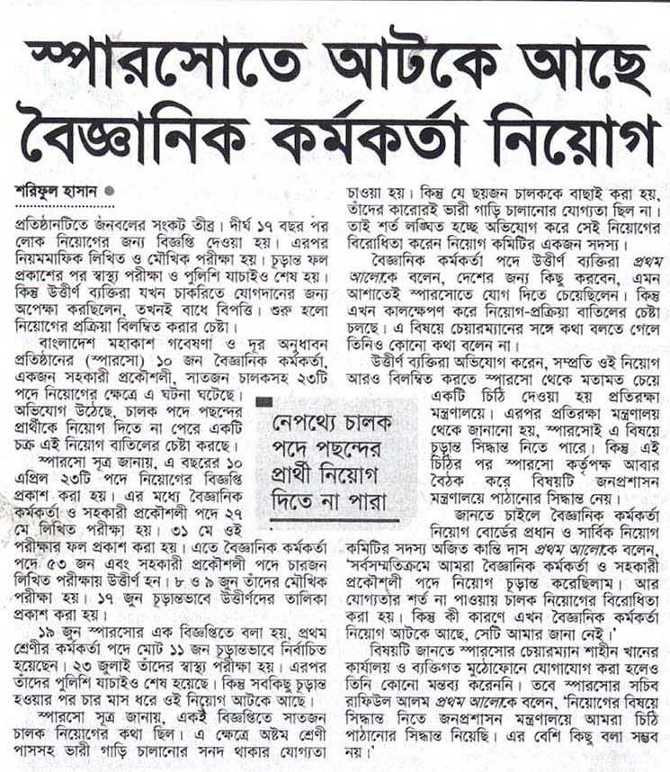 শরিফুল হাসান প্রতিষ্ঠানটিতে জনবলের সংকট তীব্র। দীর্ঘ ১৭ বছর পর লোক নিয়োগের জন্য বিজ্ঞপ্তি দেওয়া হয়। এরপর নিয়মমাফিক লিখিত ও মৌখিক পরীক্ষা হয়। চূড়ান্ত ফল প্রকাশের পর স্বাস্থ্য পরীক্ষা ও পুলিশি যাচাইও শেষ হয়। কিন্তু উত্তীর্ণ ব্যক্তিরা যখন চাকরিতে যোগদানের জন্য অপেক্ষা করছিলেন, তখনই বাধে বিপত্তি। শুরু হলো নিয়োগের প্রক্রিয়া বিলম্বিত করার চেষ্টা। বাংলাদেশ মহাকাশ …