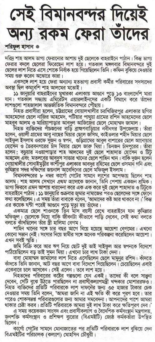 সেই বিমানবন্দর দিয়েই অন্য রকম ফেরা তাঁদের শরিফুল হাসান দরিদ্র শাহ আলম ভাগ্য ফেরানোর আশায় দুই ছেলেকে বাহরাইনে পাঠান। কিন্তু ভাগ্য ফেরার বদলে ছেলেরা ফিরেছেন লাশ হয়ে। গতকাল মঙ্গলবার বিমানবন্দরে দুই ছেলের লাশ নিতে এসে শোকে নির্বাক হয়ে গিয়েছিলেন তিনি। কফিন বুঝিয়ে দেওয়ার সময় শুরু করেন অঝোরে কান্না। একসঙ্গে লাশ হয়ে ফেরা অন্যান্য হতভাগ্য প্রবাসী …