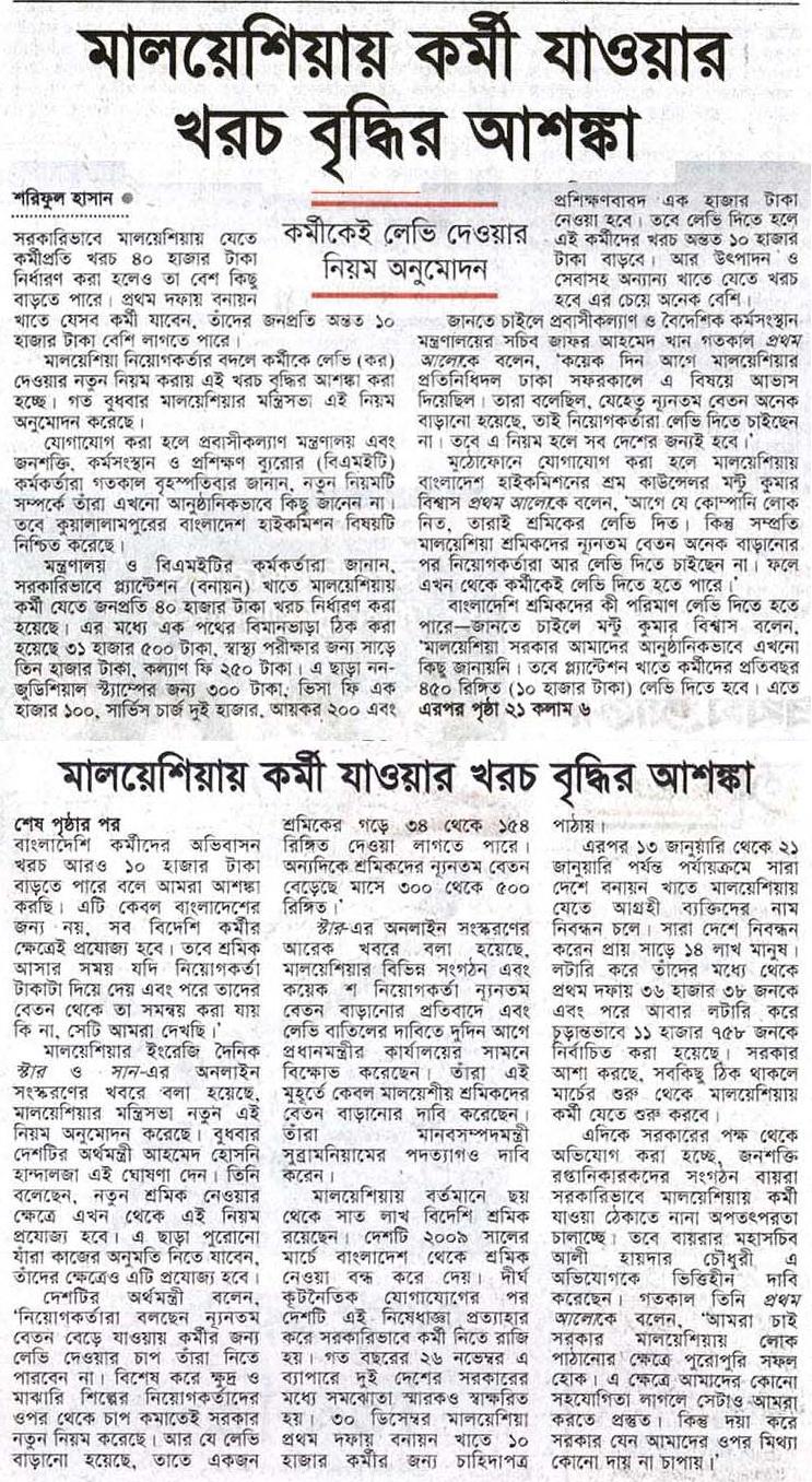 মালয়েশিয়ায় কর্মী যাওয়ার খরচ বৃদ্ধির আশঙ্কা শরিফুল হাসান সরকারিভাবে মালয়েশিয়ায় যেতে কর্মীপ্রতি খরচ ৪০ হাজার টাকা নির্ধারণ করা হলেও তা বেশ কিছু বাড়তে পারে। প্রথম দফায় বনায়ন খাতে যেসব কর্মী যাবেন, তাঁদের জনপ্রতি অন্তত ১০ হাজার টাকা বেশি লাগতে পারে।মালয়েশিয়া নিয়োগকর্তার বদলে কর্মীকে লেভি (কর) দেওয়ার নতুন নিয়ম করায় এই খরচ বৃদ্ধির আশঙ্কা করা হচ্ছে। …