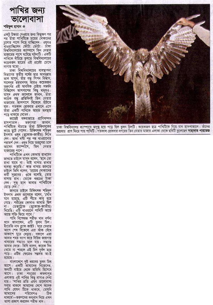শরিফুল হাসান একটু উষ্ণতা দেওয়ার জন্য কিছুক্ষণ পর পর তাঁরা পাখিটিকে চায়ের দোকানের চুলোর পাশে নিয়ে যাচ্ছিলেন। ওষুধও খাওয়াচ্ছিলেন ফোঁটা ফোঁটা। ঢাকা বিশ্ববিদ্যালয়ের ক্যাম্পাসে তিন নেতার মাজারের পাশে ঘটেছে ঘটনাটি। একটি পাখিকে বাঁচিয়ে তুলতে বিশ্ববিদ্যালয়ের কয়েকজন ছাত্রের এই প্রচেষ্টা চোখে লাগার মতো।ঢাকা বিশ্ববিদ্যালয়ের ব্যবস্থাপনা বিভাগের তৃতীয় বর্ষের ছাত্র আবদুল্লাহ আল মাসুদ, তাঁর বন্ধু শিপন বিশ্বাস, …