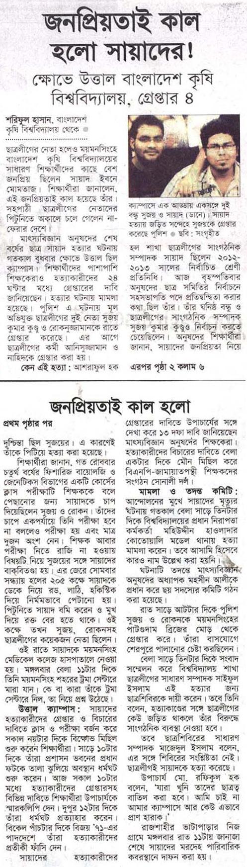 জনপ্রিয়তাই কাল হলো সায়াদের! শরিফুল হাসান ছাত্রলীগের নেতা হলেও ময়মনসিংহে বাংলাদেশ কৃষি বিশ্ববিদ্যালয়ের সাধারণ শিক্ষার্থীদের কাছে বেশ জনপ্রিয় ছিলেন সায়াদ ইবনে মোমতাজ। শিক্ষার্থীরা জানালেন, এই জনপ্রিয়তাই কাল হয়েছে তাঁর। সহপাঠী ছাত্রলীগের নেতাদের পিটুনিতে অকালে চলে গেলেন না-ফেরার দেশে।মাৎস্যবিজ্ঞান অনুষদের শেষ বর্ষের ছাত্র সায়াদ হত্যার ঘটনায় গতকাল বুধবার ক্ষোভে উত্তাল ছিল ক্যাম্পাস। শিক্ষার্থীদের পাশাপাশি শিক্ষকেরাও হত্যাকারীদের …