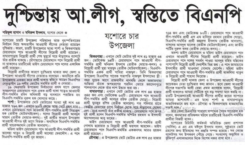 দুশ্চিন্তায় আ.লীগ, স্বস্তিতে বিএনপি শরিফুল হাসান যশোরের চারটি উপজেলা পরিষদের আজ বৃহস্পতিবারের নির্বাচন নিয়ে ক্ষমতাসীন আওয়ামী লীগের নেতারা রয়েছেন দুশ্চিন্তায়। কারণ, চারটি উপজেলার মধ্যে শার্শা ও ঝিকরগাছায় চেয়ারম্যান পদে আওয়ামী লীগের বিদ্রোহী প্রার্থী রয়েছেন। বাঘারপাড়ায় বিদ্রোহী প্রার্থী শেষ মুহূর্তে সরে দাঁড়ালেও ব্যালটে তাঁর প্রতীক থাকছে। চৌগাছাতে চেয়ারম্যান পদে বিদ্রোহী প্রার্থী না থাকলেও চারটিতেই ভাইস চেয়ারম্যান …