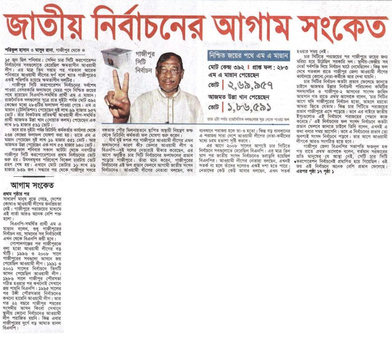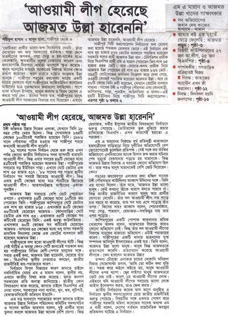 শরিফুল হাসান ‘ভোটাররা প্রার্থীর ভালো-মন্দ বিবেচনায় নেননি। তাঁরা দেখেছেন দল আর সরকারের কর্মকাণ্ড। সারা দেশে ছাত্রলীগের অপকর্ম, পদ্মা সেতু ও হল-মার্কের মতো কেলেঙ্কারি, ক্ষমতাসীন দলের নেতাদের আচরণ এবং জনভোগান্তি নিরসনে ব্যর্থতা মানুষকে ক্ষুব্ধ করেছে। মানুষ ব্যালটের মাধ্যমে সরকারের বিরুদ্ধে তাঁদের ক্ষোভ প্রকাশ করেছেন। ফলে হারতে হয়েছে আজমত উল্লা খানকে।’ গাজীপুর শহরের রথখোলা মাঠের একটি চায়ের …