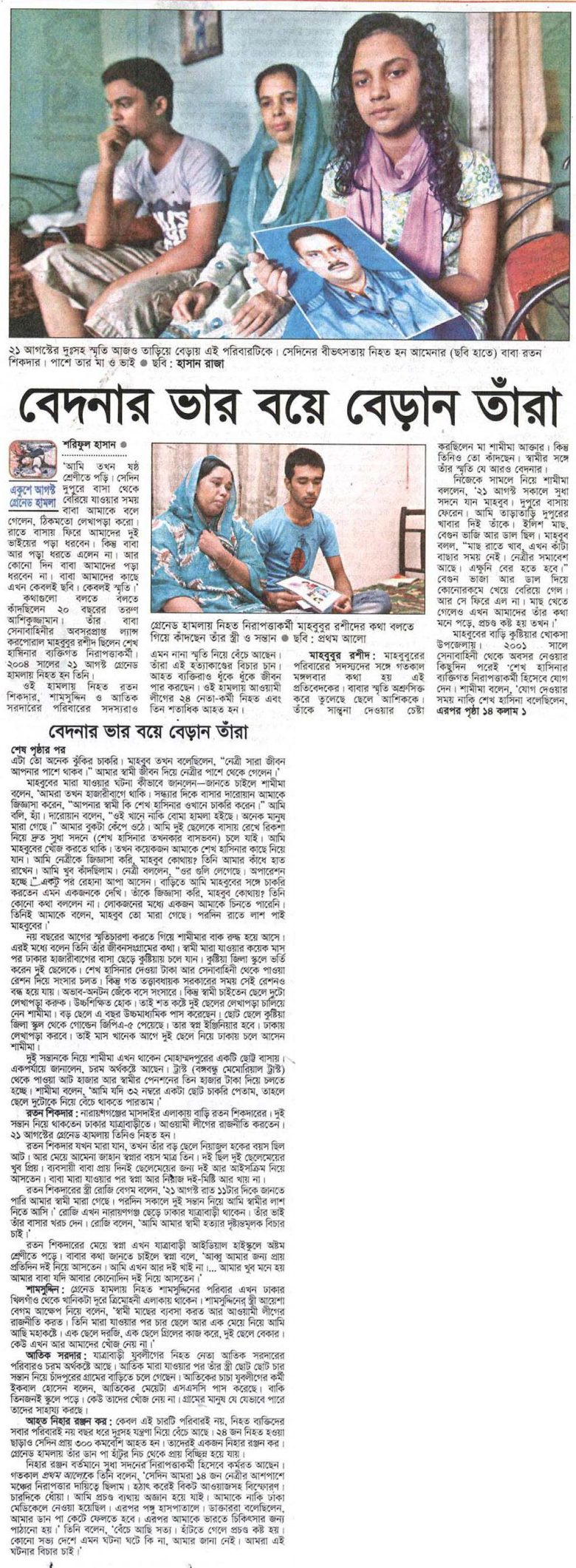 বেদনার ভার বয়ে বেড়ান তাঁরা শরিফুল হাসান ‘আমি তখন ষষ্ঠ শ্রেণীতে পড়ি। সেদিন দুপুরে বাসা থেকে বেরিয়ে যাওয়ার সময় বাবা আমাকে বলে গেলেন, ঠিকমতো লেখাপড়া করো। রাতে বাসায় ফিরে আমাদের দুই ভাইয়ের পড়া ধরবেন। কিন্তু বাবা আর পড়া ধরতে এলেন না। আর কোনো দিন বাবা আমাদের পড়া ধরবেন না। বাবা আমাদের কাছে এখন কেবলই ছবি। …