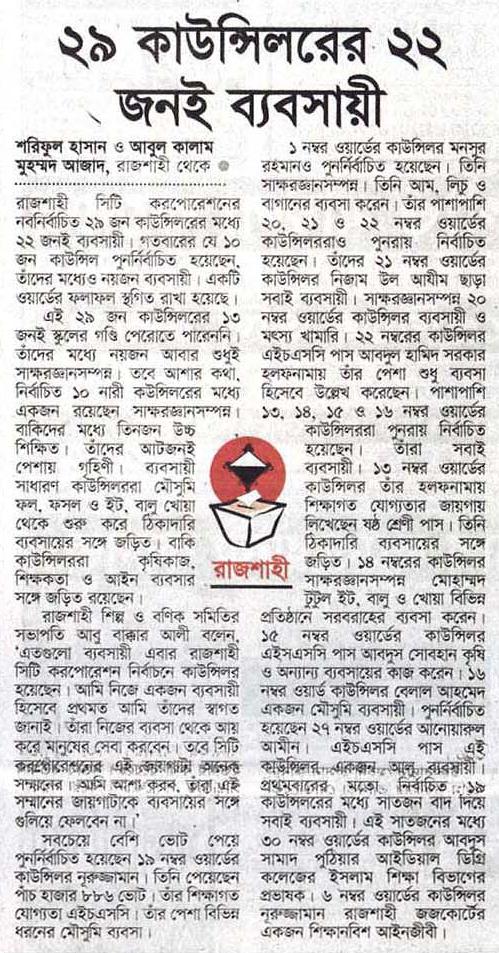 ২৯ কাউন্সিলরের ২২ জনই ব্যবসায়ী শরিফুল হাসান রাজশাহী সিটি করপোরেশনের নবনির্বাচিত ২৯ জন কাউন্সিলরের মধ্যে ২২ জনই ব্যবসায়ী। গতবারের যে ১০ জন কাউন্সিল পুনর্নির্বাচিত হয়েছেন, তাঁদের মধ্যেও নয়জন ব্যবসায়ী। একটি ওয়ার্ডের ফলাফল স্থগিত রাখা হয়েছে। এই ২৯ জন কাউন্সিলরের ১৩ জনই স্কুলের গণ্ডি পেরোতে পারেননি। তাঁদের মধ্যে নয়জন আবার শুধুই সাক্ষরজ্ঞানসম্পন্ন। তবে আশার কথা, নির্বাচিত …