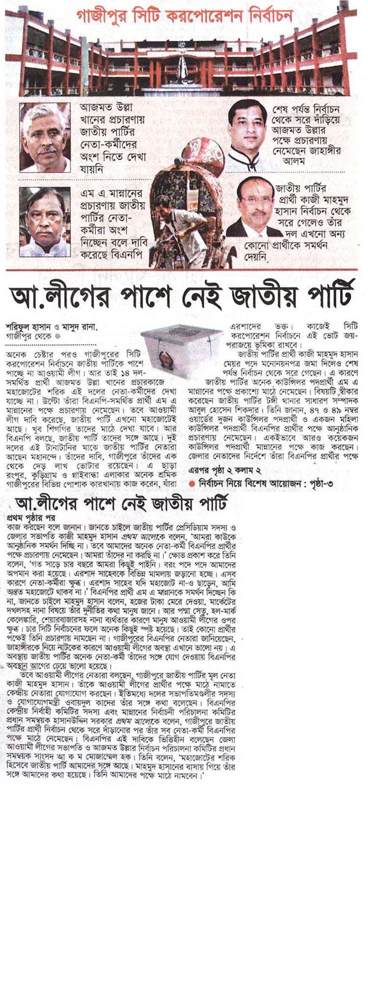 আ.লীগের পাশে নেই জাতীয় পার্টি শরিফুল হাসান অনেক চেষ্টার পরও গাজীপুরের সিটি করপোরেশন নির্বাচনে জাতীয় পার্টিকে পাশে পাচ্ছে না আওয়ামী লীগ। আর তাই ১৪ দল-সমর্থিত প্রার্থী আজমত উল্লা খানের প্রচারকাজে মহাজোটের শরিক এই দলের নেতা-কর্মীদের দেখা যাচ্ছে না। উল্টো তাঁরা বিএনপি-সমর্থিত প্রার্থী এম এ মান্নানের পক্ষে প্রচারণায় নেমেছেন। তবে আওয়ামী লীগ দাবি করেছে, জাতীয় পার্টি …