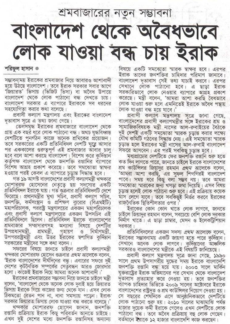 বাংলাদেশ থেকে অবৈধভাবে লোক যাওয়া বন্ধ চায় ইরাক শরিফুল হাসান সম্ভাবনাময় ইরাকের শ্রমবাজার নিয়ে আবারও আশাবাদী হয়ে উঠছে বাংলাদেশ। তবে ইরাক সরকার সবার আগে ‘জিয়ারত’ ভিসায় (ভিজিট ভিসা) বা অবৈধ উপায়ে বাংলাদেশ থেকে লোক পাঠানো বন্ধ দেখতে চায়। বাংলাদেশ সরকার এ ব্যাপারে ইরাককে সব ধরনের সহযোগিতা করার কথা বলেছে। প্রবাসী কল্যাণ মন্ত্রণালয় এবং ইরাকের বাংলাদেশ …