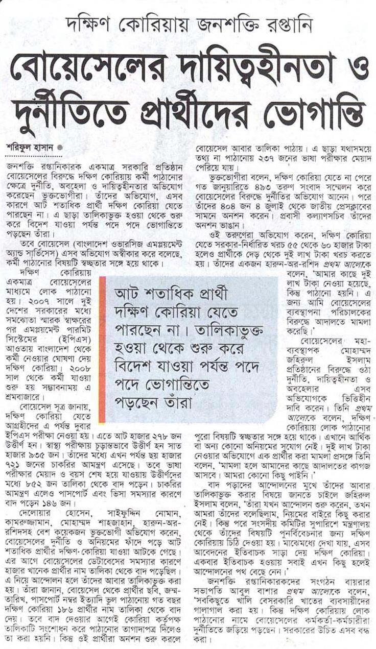 বোয়েসেলের দায়িত্বহীনতা ও দুর্নীতিতে প্রার্থীদের ভোগান্তি শরিফুল হাসান জনশক্তি রপ্তানিকারক একমাত্র সরকারি প্রতিষ্ঠান বোয়েসেলের বিরুদ্ধে দক্ষিণ কোরিয়ায় কর্মী পাঠানোর ক্ষেত্রে দুর্নীতি, অবহেলা ও দায়িত্বহীনতার অভিযোগ করেছেন ভুক্তভোগীরা। তাঁদের অভিযোগ, এসব কারণে আট শতাধিক প্রার্থী দক্ষিণ কোরিয়া যেতে পারছেন না। এ ছাড়া তালিকাভুক্ত হওয়া থেকে শুরু করে বিদেশ যাওয়া পর্যন্ত পদে পদে ভোগান্তিতে পড়ছেন তাঁরা। তবে …