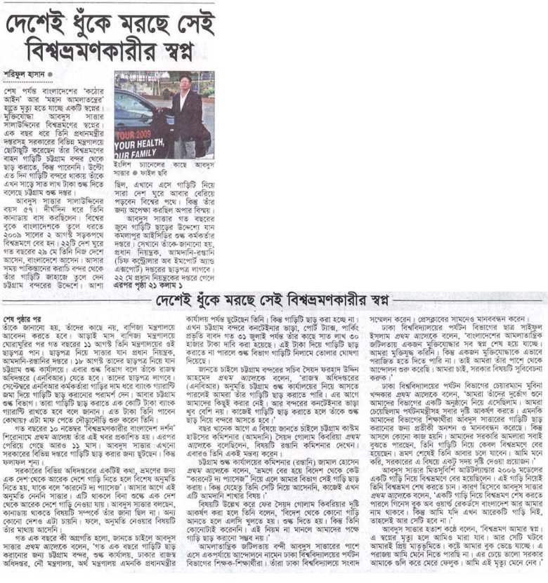 শরিফুল হাসান শেষ পর্যন্ত বাংলাদেশের ‘কঠোর আইন’ আর ‘মহান আমলাতন্ত্রের’ হাতে মৃত্যু হতে যাচ্ছে একটি স্বপ্নের। মুক্তিযোদ্ধা আবদুস সাত্তার সালাউদ্দিনের বিশ্বভ্রমণের স্বপ্নের। এক বছর ধরে তিনি প্রধানমন্ত্রীর দপ্তরসহ সরকারের বিভিন্ন মন্ত্রণালয়ে ছোটাছুটি করেছেন তাঁর বিশ্বভ্রমণের বাহন গাড়িটি চট্টগ্রাম বন্দর থেকে ছাড় করাতে, কিন্তু পারেননি। উল্টো এত দিন গাড়িটি বন্দরে থাকায় তাঁকে এখন সাড়ে সাত লাখ …