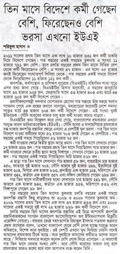 শরিফুল হাসান ২০১১ সালের প্রথম তিন মাসে এক লাখ ১০ হাজার ৯৩১ জন কর্মী চাকরি নিয়ে বিদেশে গেছেন। গত বছরের একই সময়ের তুলনায় এ সংখ্যা ১১ হাজার ৭৯১ জন বেশি। তবে চলতি বছরের প্রথম তিন মাসে বিভিন্ন দেশ থেকে কর্মী ফিরেছেনও বেশি। এ সংখ্যা ৪৭ হাজার। এর মধ্যে ৩৫ হাজার জনই ফিরেছেন সংঘাতপূর্ণ লিবিয়া থেকে। …