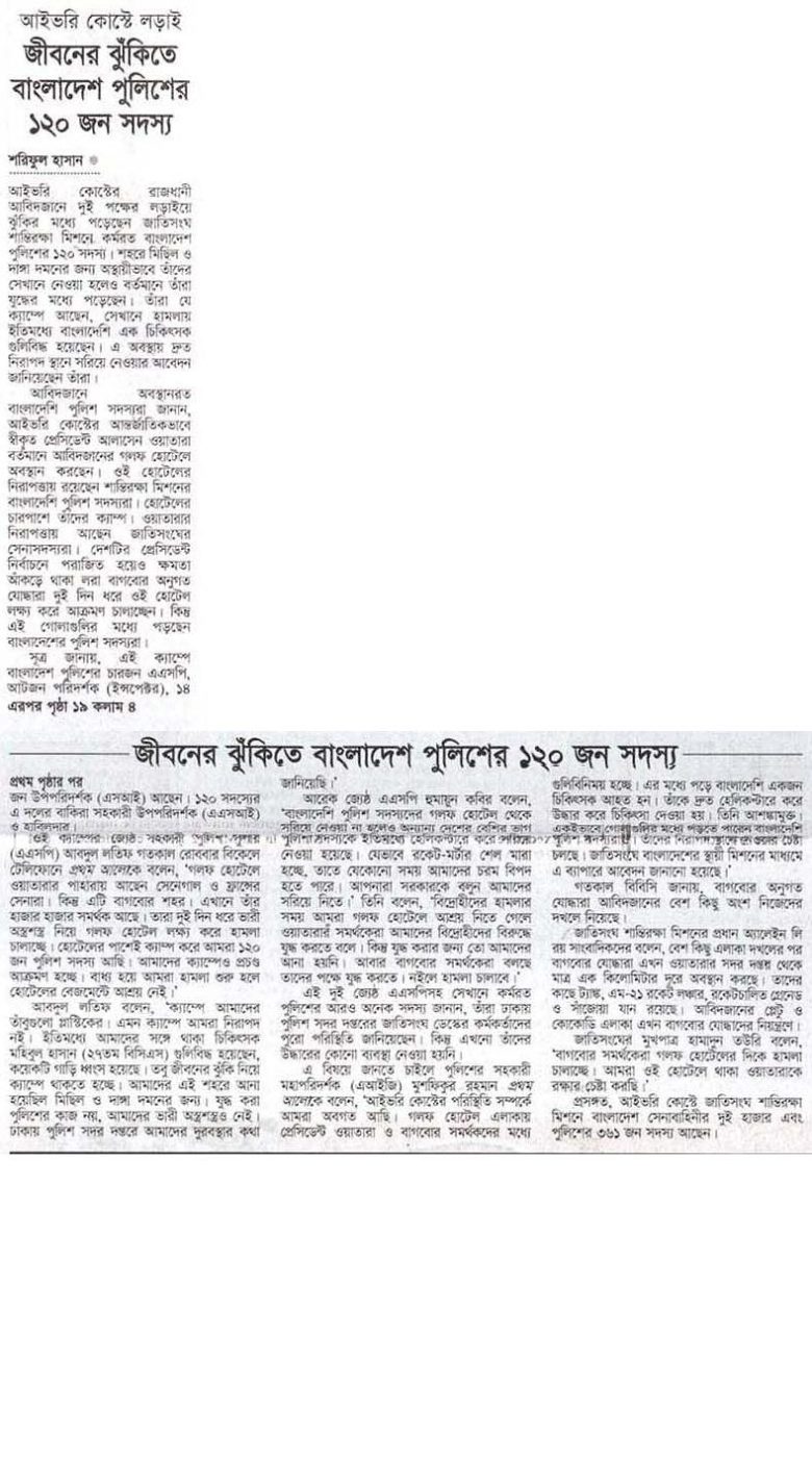 জীবনের ঝুঁকিতে বাংলাদেশ পুলিশের ১২০ জন সদস্য শরিফুল হাসান আইভরি কোস্টের রাজধানী আবিদজানে দুই পক্ষের লড়াইয়ে ঝুঁকির মধ্যে পড়েছেন জাতিসংঘ শান্তিরক্ষা মিশনে কর্মরত বাংলাদেশ পুলিশের ১২০ সদস্য। শহরে মিছিল ও দাঙ্গা দমনের জন্য অস্থায়ীভাবে তাঁদের সেখানে নেওয়া হলেও বর্তমানে তাঁরা যুদ্ধের মধ্যে পড়েছেন। তাঁরা যে ক্যাম্পে আছেন, সেখানে হামলায় ইতিমধ্যে বাংলাদেশি এক চিকিৎসক গুলিবিদ্ধ হয়েছেন। …