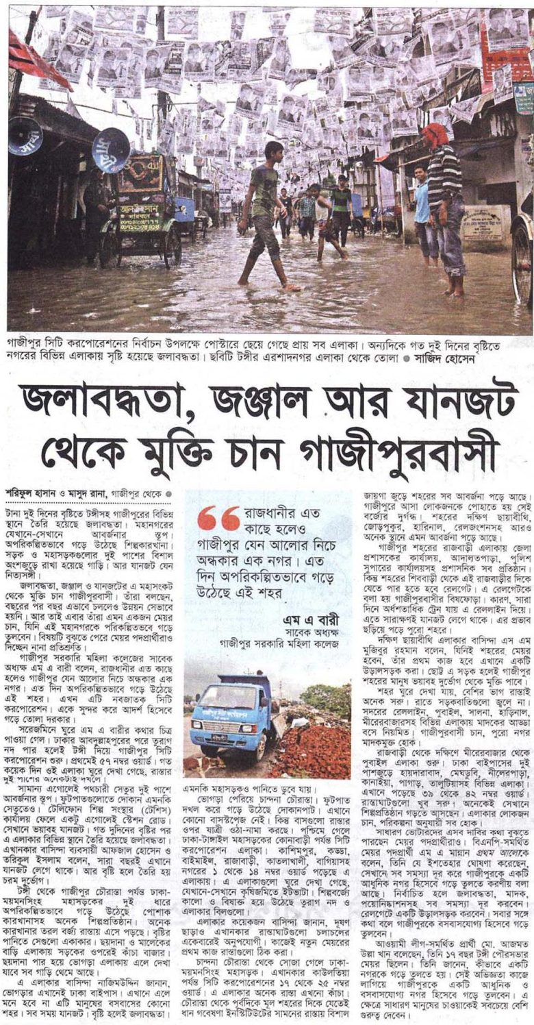শরিফুল হাসান টানা দুই দিনের বৃষ্টিতে টঙ্গীসহ গাজীপুরের বিভিন্ন স্থানে তৈরি হয়েছে জলাবদ্ধতা। মহানগরের যেখানে-সেখানে আবর্জনার স্তূপ। অপরিকল্পিতভাবে গড়ে উঠেছে শিল্পকারখানা। সড়ক ও মহাসড়কগুলোর দুই পাশের বিশাল অংশজুড়ে রাখা হয়েছে গাড়ি। আর যানজট যেন নিত্যসঙ্গী। জলাবদ্ধতা, জঞ্জাল ও যানজটের এ মহাসংকট থেকে মুক্তি চান গাজীপুরবাসী। তাঁরা বলছেন, বছরের পর বছর এভাবে চললেও উন্নয়ন সেভাবে হয়নি। …