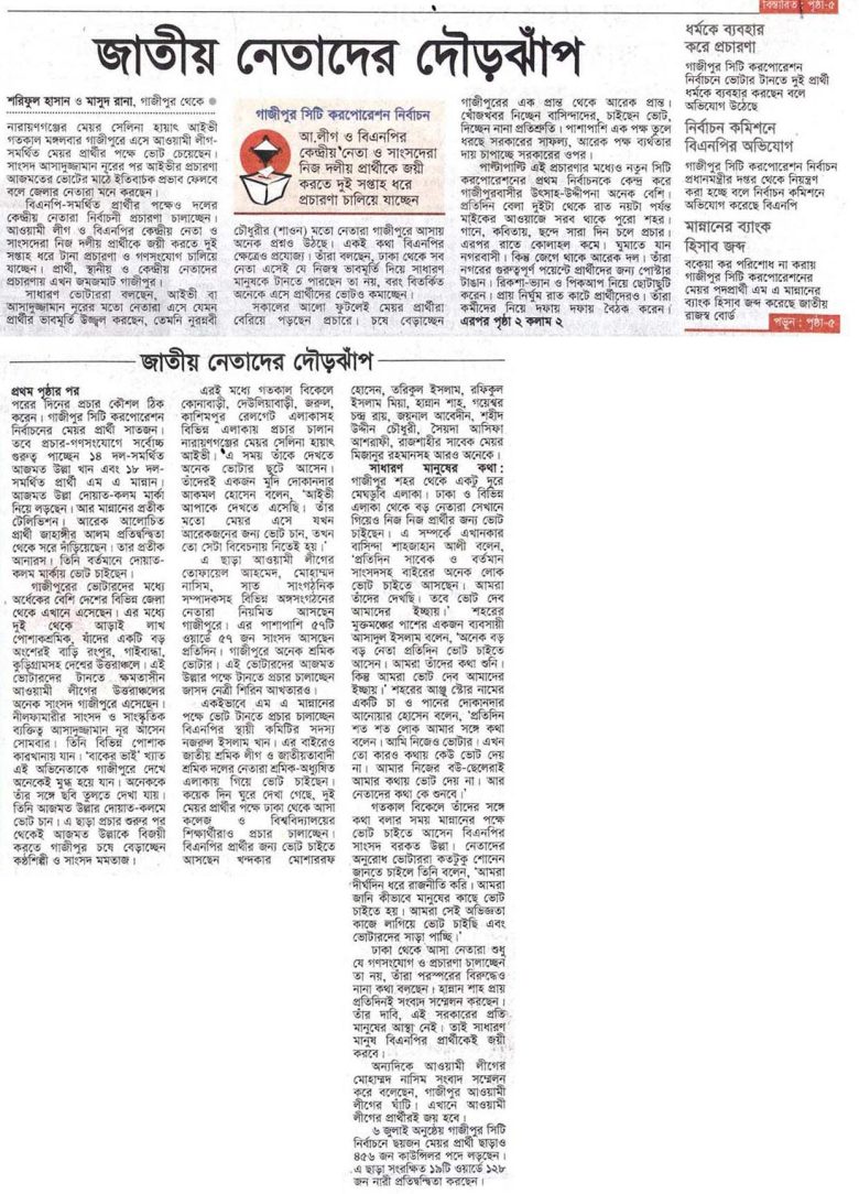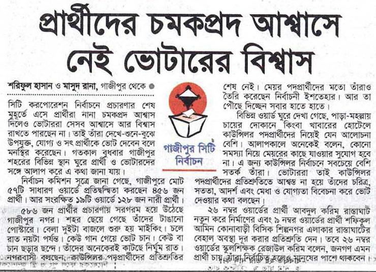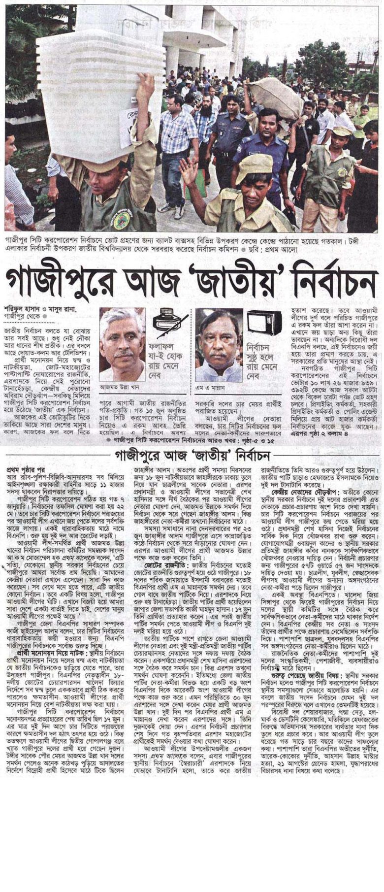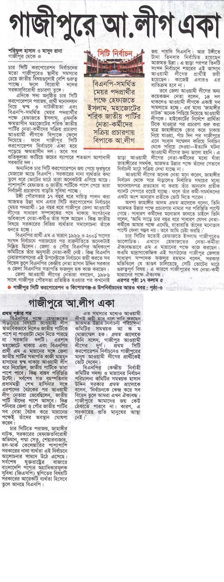 গাজীপুরে আ.লীগএকা শরিফুল হাসান চার সিটি করপোরেশন নির্বাচনের মতো গাজীপুরেও স্থানীয় সমস্যার চেয়ে জাতীয় বিষয়গুলোই বেশি গুরুত্ব পাচ্ছে। ফলে বিরোধী দলের সরকারবিরোধী প্রচারণা তুঙ্গে।এদিকে সদ্য অনুষ্ঠিত চার সিটি করপোরেশনে পরাজয়, প্রার্থী মনোননয়ন নিয়ে দ্বন্দ্ব ও নাটকীয়তা এবং বিএনপি-সমর্থিত মেয়র পদপ্রার্থীর পক্ষে হেফাজতে ইসলাম, এমনকি ক্ষমতাসীন মহাজোটের শরিক জাতীয় পার্টির নেতা-কর্মীদের সক্রিয় প্রচারণা আওয়ামী লীগকে বিপাকে …