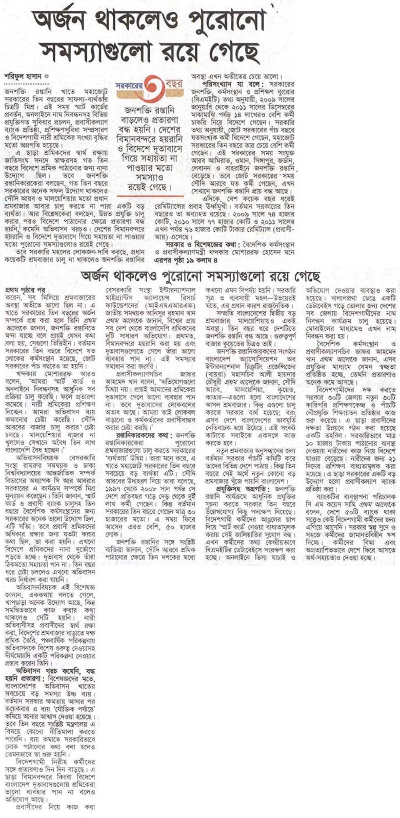 অর্জন থাকলেও পুরোনো সমস্যাগুলো রয়ে গেছে শরিফুল হাসান জনশক্তি রপ্তানি খাতে মহাজোট সরকারের তিন বছরের সাফল্য-ব্যর্থতার চিত্রটি মিশ্র। এই সময় স্মার্ট কার্ডের প্রবর্তন, অনলাইনে নাম নিবন্ধনসহ বিভিন্ন প্রযুক্তিগত সুবিধার প্রচলন, প্রবাসীকল্যাণ ব্যাংক প্রতিষ্ঠা, প্রশিক্ষণসুবিধা সম্প্রসারণ ও বিদেশগামী নারী শ্রমিকের সংখ্যা বৃদ্ধির মতো অগ্রগতি হয়েছে।এ ছাড়া শ্রমিকদের স্বার্থ রক্ষায় জাতিসংঘ সনদে স্বাক্ষরসহ গত তিন বছরে বিদেশে …