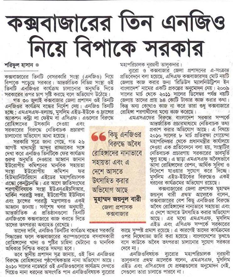 শরিফুল হাসান কক্সবাজারের তিনটি বেসরকারি সংস্থা (এনজিও) নিয়ে বিপাকে পড়েছে সরকার। আন্তর্জাতিক বিভিন্ন সংস্থা ওই তিনটি এনজিওর কার্যক্রম চালানোর অনুমতি দিতে সরকারের ওপর চাপ সৃষ্টি করছে বলে অভিযোগ উঠেছে। গত ৩০ জুলাই কক্সবাজার জেলা প্রশাসন ওই তিনটি এনজিওর কার্যক্রম বন্ধের নির্দেশ দেয়। এনজিও তিনটি হচ্ছে: এমএসএফ-হল্যান্ড, মুসলিম এইড-ইউকে ও ফ্রান্সের অ্যাকশন কন্ট্রা লা ফেইম বা …