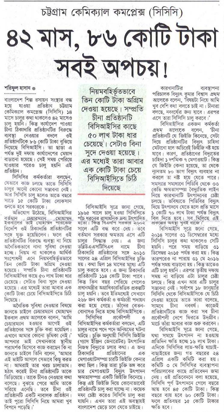 ৪২ মাস, ৮৬ কোটি টাকা সবই অপচয়! শরিফুল হাসান বাংলাদেশ শিল্প রসায়ন সংস্থার বন্ধ হয়ে যাওয়া প্রতিষ্ঠান চট্টগ্রাম কেমিক্যাল কমপ্লেক্স (সিসিসি) ১৪ মাসে চালুর কথা থাকলেও ৪২ মাসেও চালু হয়নি। কিন্তু কার্যাদেশ পাওয়া চীনা ঠিকাদারি প্রতিষ্ঠানটির বিরুদ্ধে ব্যবস্থা নেওয়ার বদলে ওই প্রতিষ্ঠানটিকে ৮৬ কোটি টাকা বুঝিয়ে দিয়েছে বিসিআইসি। তা ছাড়া এ পর্যন্ত দুই দফায় কার্যাদেশের …